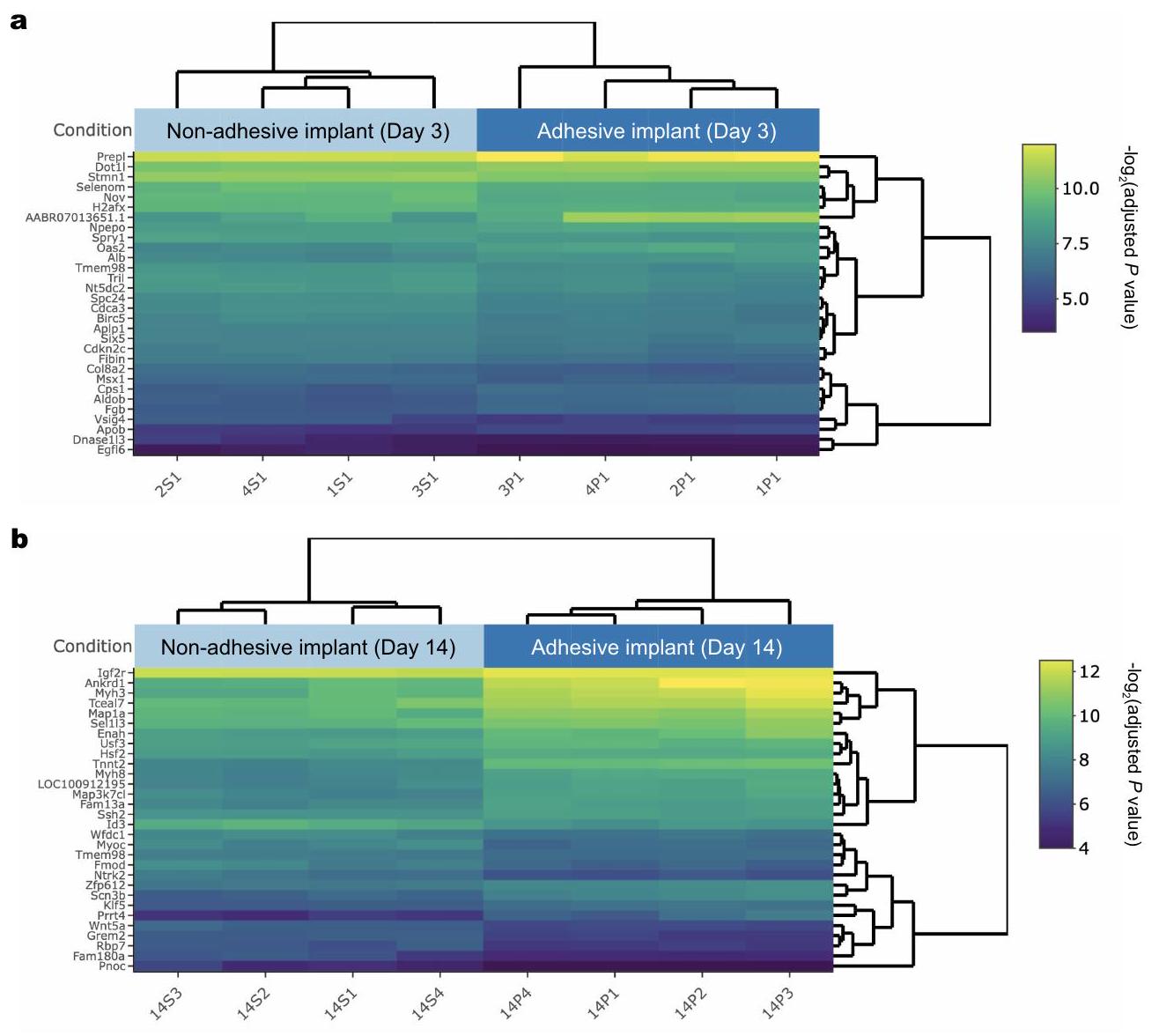 -clustering heatmap to visualize the expression profiles of the top 30 differentially expressed genes sorted by their adjusted value by plotting their transformed expression values in samples day 3 (a) and day 14 (b)