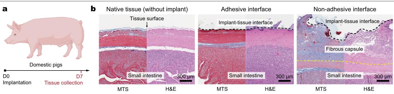 to the small intestine. Black dotted lines in images indicate the implant-tissue interface; yellow dotted lines in images indicate the fibrous capsule-tissue interface. The experiment was repeated independently ( per group) with similar results. The graphic of the pig in a was created with BioRender.com.