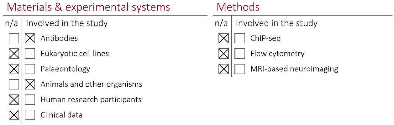 We require information from authors about some types of materials, experimental systems and methods used in many studies. Here, indicate whether each material, system or method listed is relevant to your study. If you are not sure if a list item applies to your research, read the appropriate section before selecting a response.