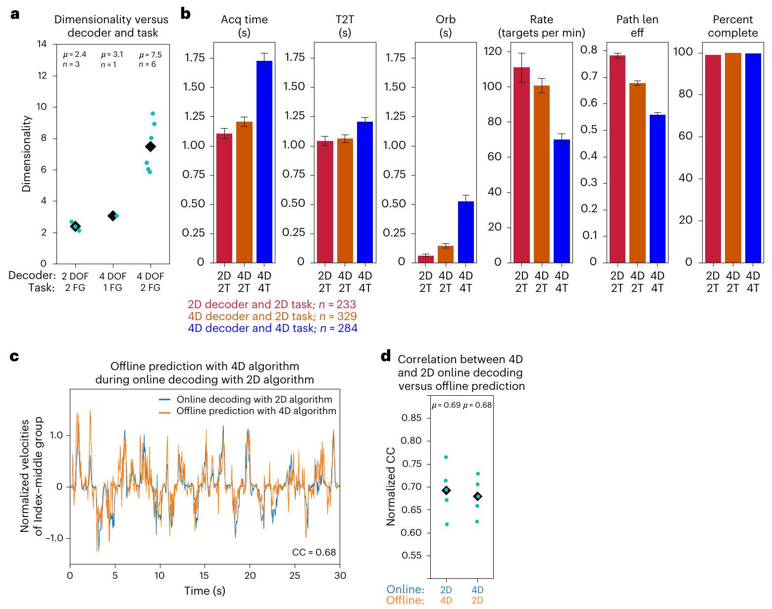 الشكل 1 | نظام iBCI لحركات الأصابع البارعة. أ، تم وضع شاشة الكمبيوتر أمام المشارك بحيث يمكنه أداء مهمة إصبع باستخدام يد افتراضية. خلال التحكم في الحلقة المغلقة، يتم رسم النشاط الكهربائي من المجموعة إلى إشارة تحكم للأصابع الافتراضية. تم تعديل اللوحة من المرجع 27. ب، يسار، يتحرك الإبهام في بعدين، التباعد (Ab) والتقارب (Ad) (الانثناء/التمديد والتباعد/التقارب)، وتتحرك الأصابع الوسطى والخاتمية في قوس أحادي البعد. يمين، تجارب تظهر أهدافًا نموذجية لجميع مجموعات الأصابع الثلاثة لمهمة الأربعة درجات من الحرية. ج، يتم تصوير مقطع زمني مدته 100 ثانية من الحركات المفككة النموذجية لمجموعة الأصابع الثلاثة، مهمة الأربعة درجات من الحرية. يتم وصف المسارات على مدى يتراوح من -1 إلى 1، حيث يشير 1 إلى الانثناء الكامل (flex) أو التباعد (ab) و-1 يشير إلى التمديد (ext) أو التقارب (ad). د، المسارات لكتلة تجريبية توضيحية من 50 تجربة لحركات الإبهام ثنائية الأبعاد، تظهر فقط التجارب التي يتحرك فيها الإبهام لمسافة أكبر من 0.3. يمثل كل لون تجارب متزاوجة متميزة، من المركز إلى الخارج. هـ، إحصائيات ملخصة تقارن بين مهمتي درجتين وأربعة درجات من الحرية لوقت الاكتساب (Acq time)، ووقت الهدف (T2T)، ووقت الدوران (Orb)، ومعدل الاكتساب (Rate)، وكفاءة طول المسار (Path len eff) ونسبة التجارب التي تم إكمالها بنجاح (نسبة الاكتمال). تمثل أشرطة الخطأ الخطأ المعياري للمتوسط. كانت هناك
