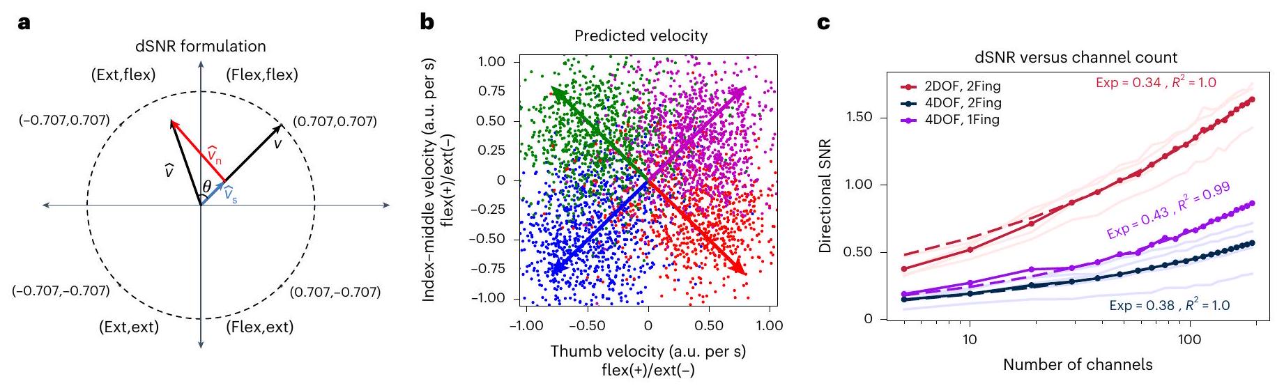 تُستخدم حركات الأصابع المقصودة لحساب dSNR. تمثل الأسهم القيمة المثالية/الحقيقية لكل وضعية إصبع ممكنة بناءً على حركة الإصبع المقصودة المفترضة. ج، يُظهر dSNR كدالة لعدد القنوات لمشفّر الأبعاد الثنائية في مهمة الهدفين/التجربة (2Fing، أحمر)، ومشفّر الأبعاد الرباعية في مهمة الهدفين/التجربة (2Fing، أزرق) ومشفّر الأبعاد الرباعية في مهمة الهدف الواحد/التجربة (1Fing، بنفسجي). يتم تصوير حساب تجريبي لـ dSNR لكل يوم في خطوط ملونة فاتحة والقيمة المتوسطة كخط صلب داكن. تتوافق الخطوط المنقطة مع ملاءمة خطية باستخدام طريقة المربعات الصغرى لـ