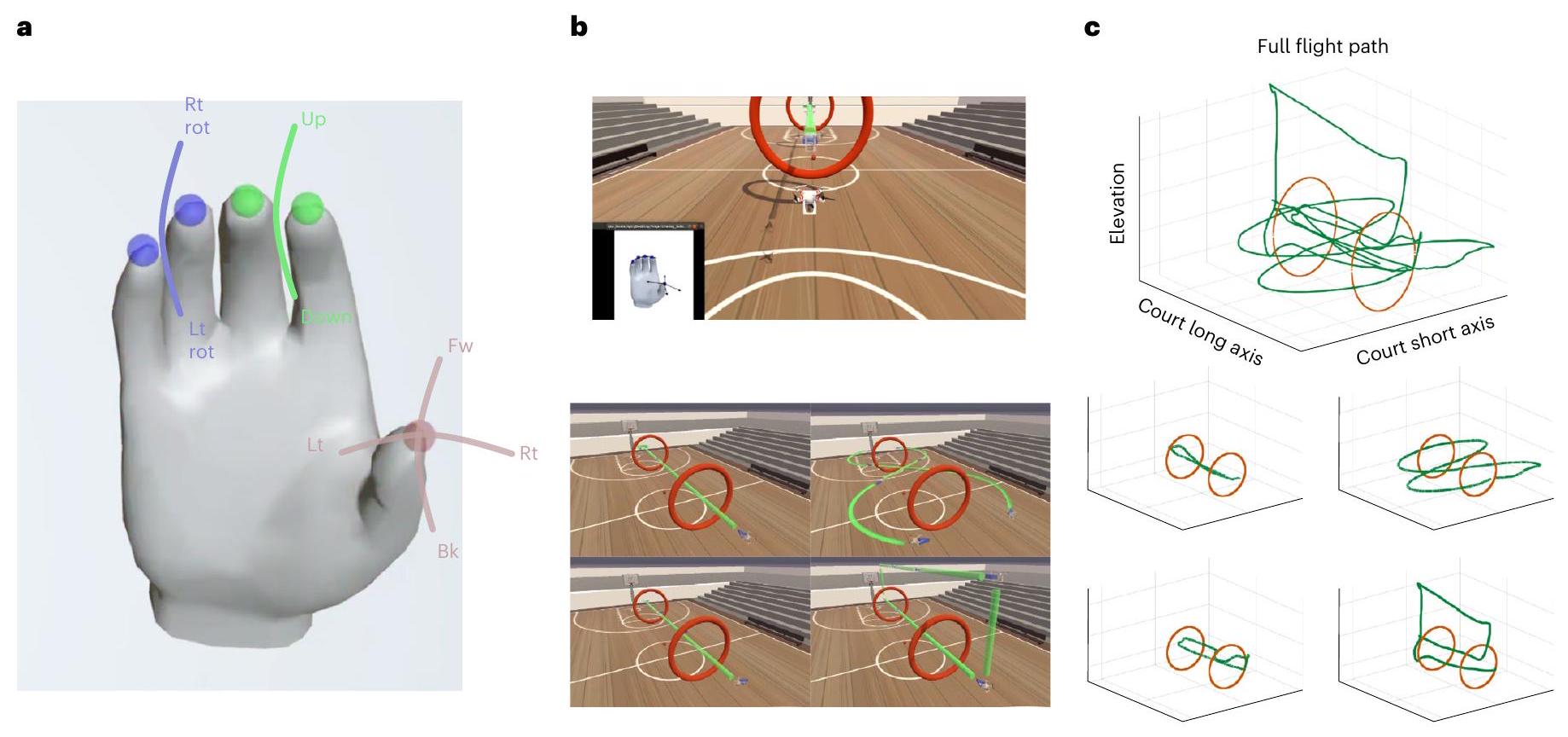The virtual finger display was developed in Unity (2021.3.9f1). A physics-based quadcopter environment used the Microsoft AirSim plugin41 as a quadcopter simulator in Unity (2019.3.12f1). The Neural Signal Processor sends the digital signal to a SuperLogics machine running Simulink Real-Time (v2019, Mathworks, Natick, MA). This computer communicated with a Linux computer running Ubuntu with Python (v3.7.11), PyTorch (v1.12.1, https://pytorch.org/), and Redis (v7.02), where custom code performed decoding, control of the virtual environment in Unity, and training of the neural network. The entire system was interfaced with an additional Windows computer running Matlab (v2019, Mathworks, Natick, MA) that was interfaced with the system to stop and start experimental runs during sessions.