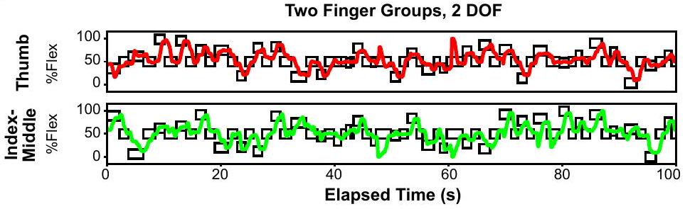 was cued to simultaneously move the finger groups from a center ‘neutral’ position toward random targets within the active range of motion. Once reaching the target, all fingers were required to be within the target for 500 ms for the trial to be successfully completed. On the subsequent trial, targets were placed back at the center. The target width was