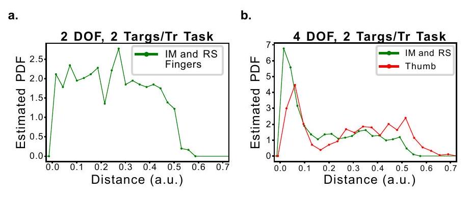 curve represents combined IM finger and RL finger flexion/extension distances, and the orange curve represents the 2D distance for the thumb (combining the 2D components of flexion/extension and abduction/adduction) for trials using the 4D decoder and task in Fig. 1e. a.u., arbitrary units; DOF, degree of freedom; PDF, probability distribution function.