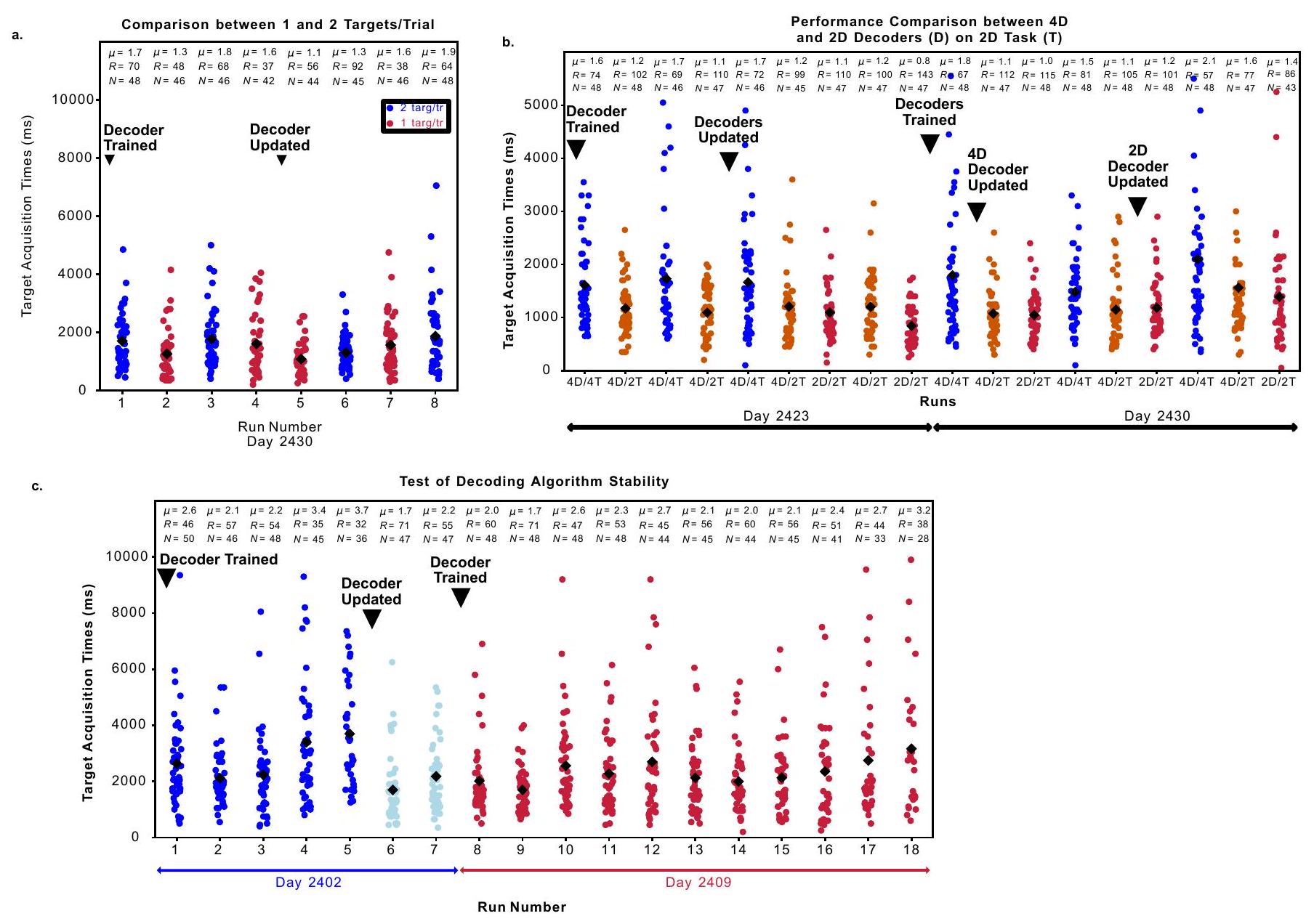 collection represent consecutive blocks without re-training unless otherwise indicated. The labels 4D/4T indicate the 4D decoder run on 4T; 4D/2T indicates the 4D decoder on 2T; and 2D/2T indicates the 2D decoder on 2T. c, Decoder stability test for 2 trial days using the 4-DOF decoder for 2 new targets/trial. For days 2402 (blue and light blue) and 2409 (red), the decoder was trained (upside down triangle with “Decoder Trained”) and then used in consecutive blocks until trials could not be reliably completed. On day 2402 , the decoder was retrained (“Decoder Updated”) to demonstrate the recovery of performance on 2 subsequent blocks (light blue).