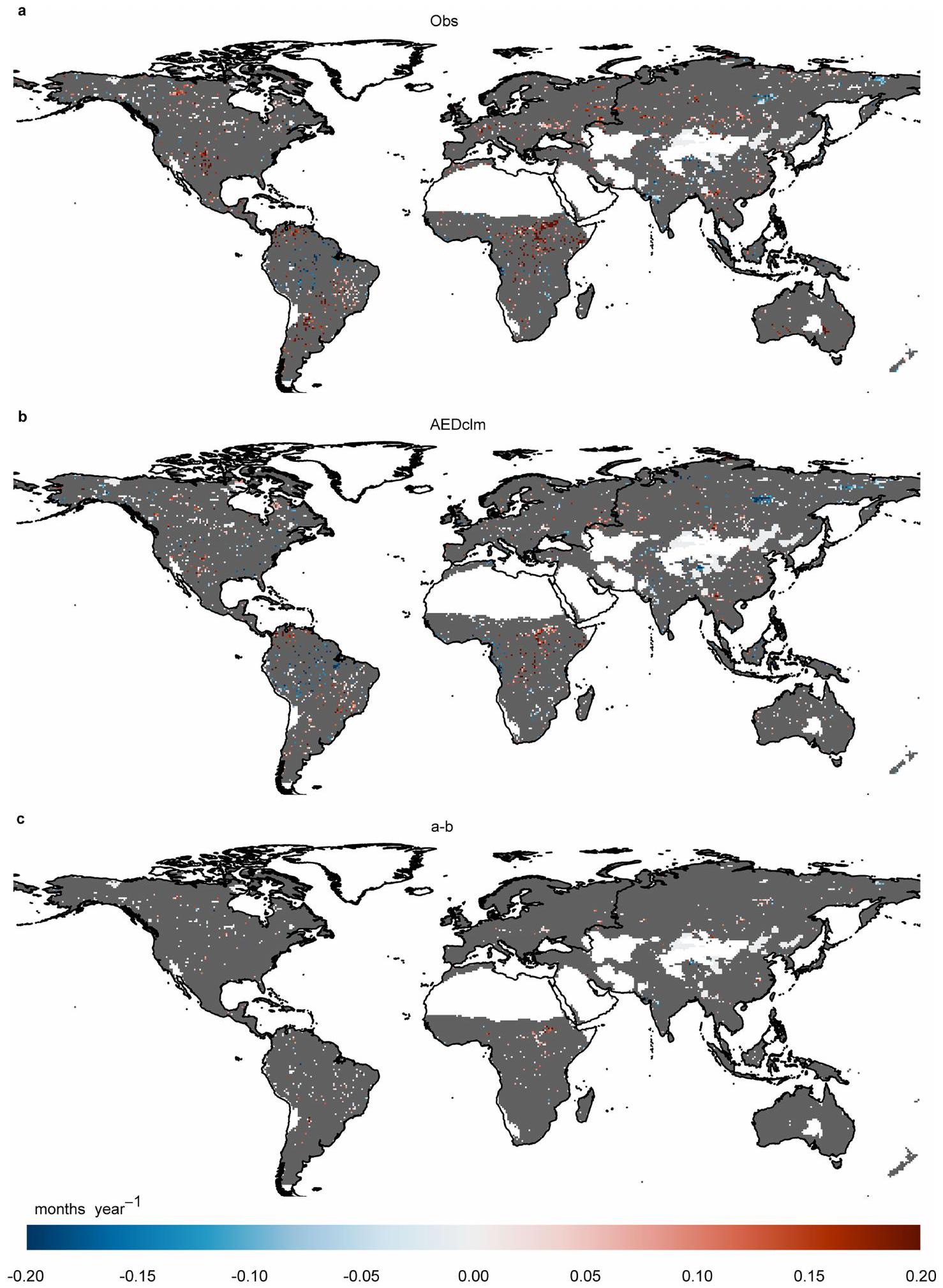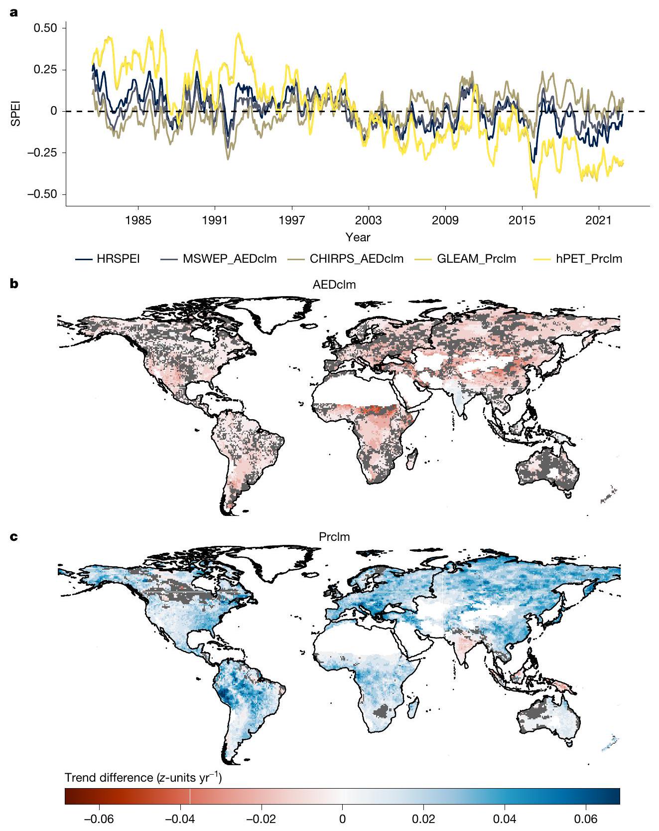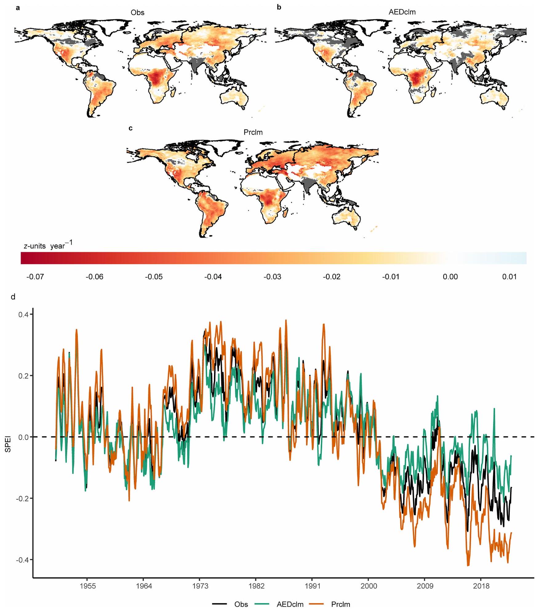 observations (observed precipitation and AED) and SPEI based on observed precipitation and climatology of AED (AEDclm). c, The trend difference between SPEI based on observations and SPEI based on observed AED and climatology of precipitation (Prclm). Non-significant trends (