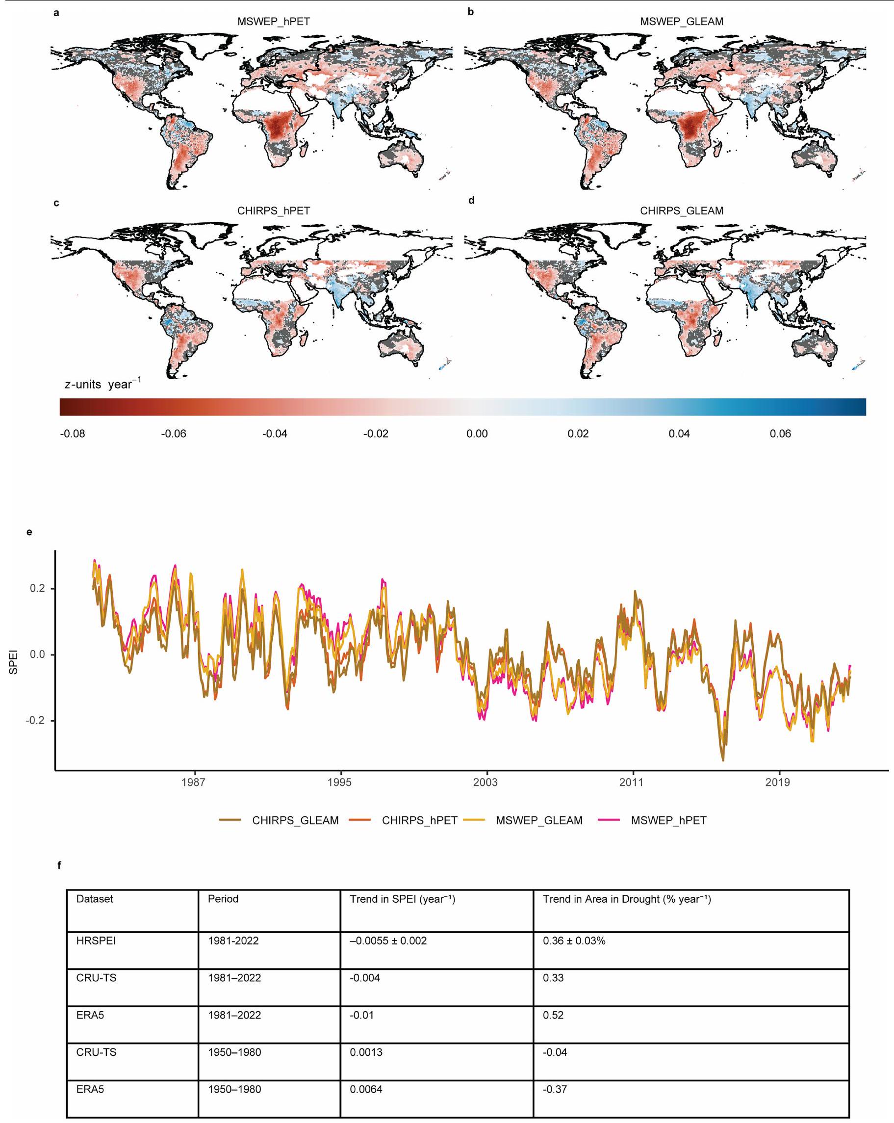 through the Centre for Environmental Data Analysis (CEDA) at https:// doi.org/10.5285/ac43da11867243a1bb414e1637802dec and onJASMIN at/badc/hydro-jules/data/Global_drought_indices. The CHIRPS data can be accessed via the Climate Hazards Group (CHG) at https://www. chc.ucsb.edu/data/chirps/ (ref. 40). The MSWEP precipitation dataset is available from the GloH2O website at https://www.gloh2o.org/ mswep/ (ref. 41). The hPET dataset is hosted by the University of Bristol at https://data.bris.ac.uk/data/dataset/qb8ujazzda0s2aykkv0oq0ctp (ref. 43). The AED data from GLEAM can be accessed at https://www. gleam.eu/ (ref. 42). The CRU-TS precipitation and AED datasets are available through CEDA at https://data.ceda.ac.uk/badc/cru/data/ cru_ts/cru_ts_4.08/(ref.50). The ERA5 dataset is available for download from the Copernicus Climate Change Service’s Climate Data Store at https://cds.climate.copernicus.eu/datasets (ref. 51).
