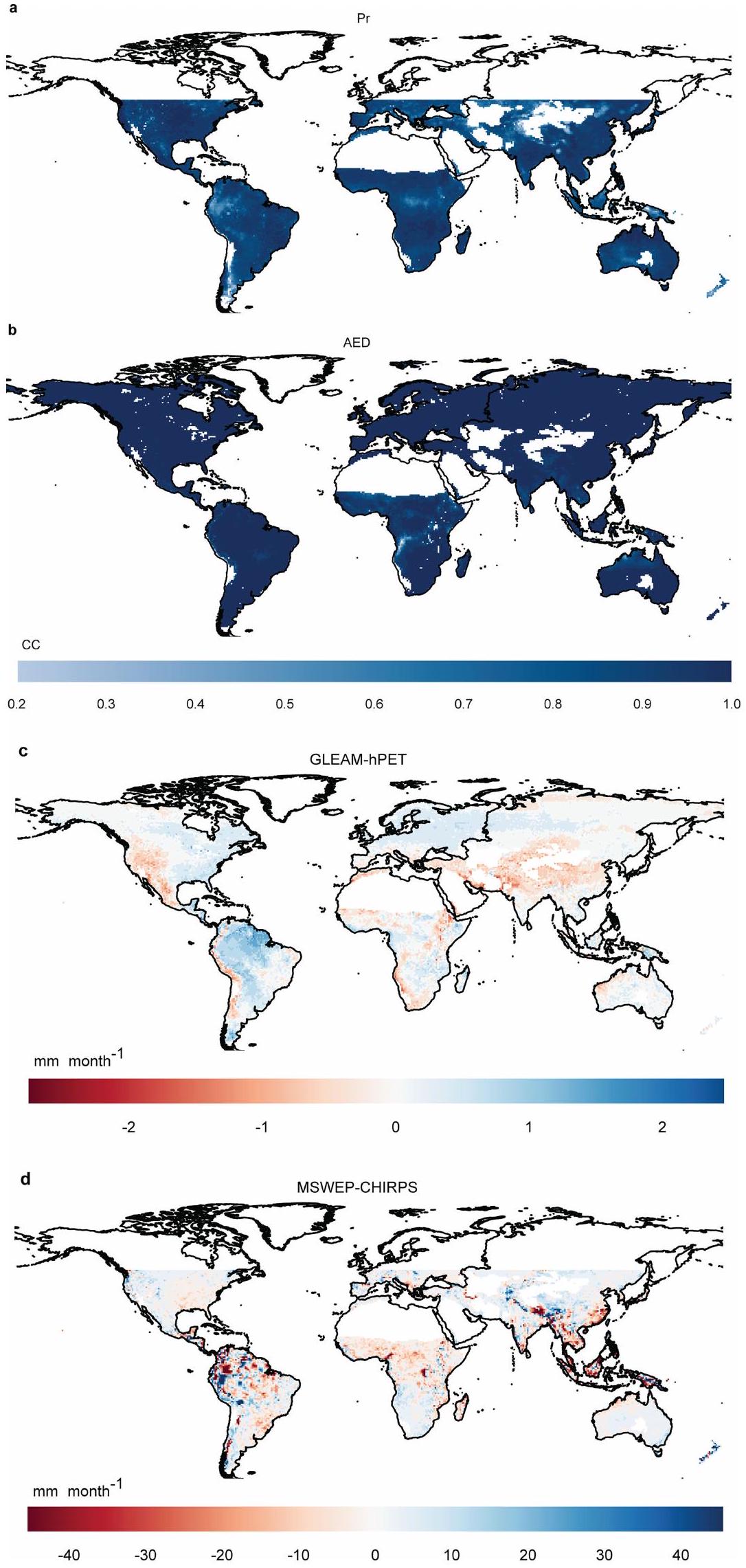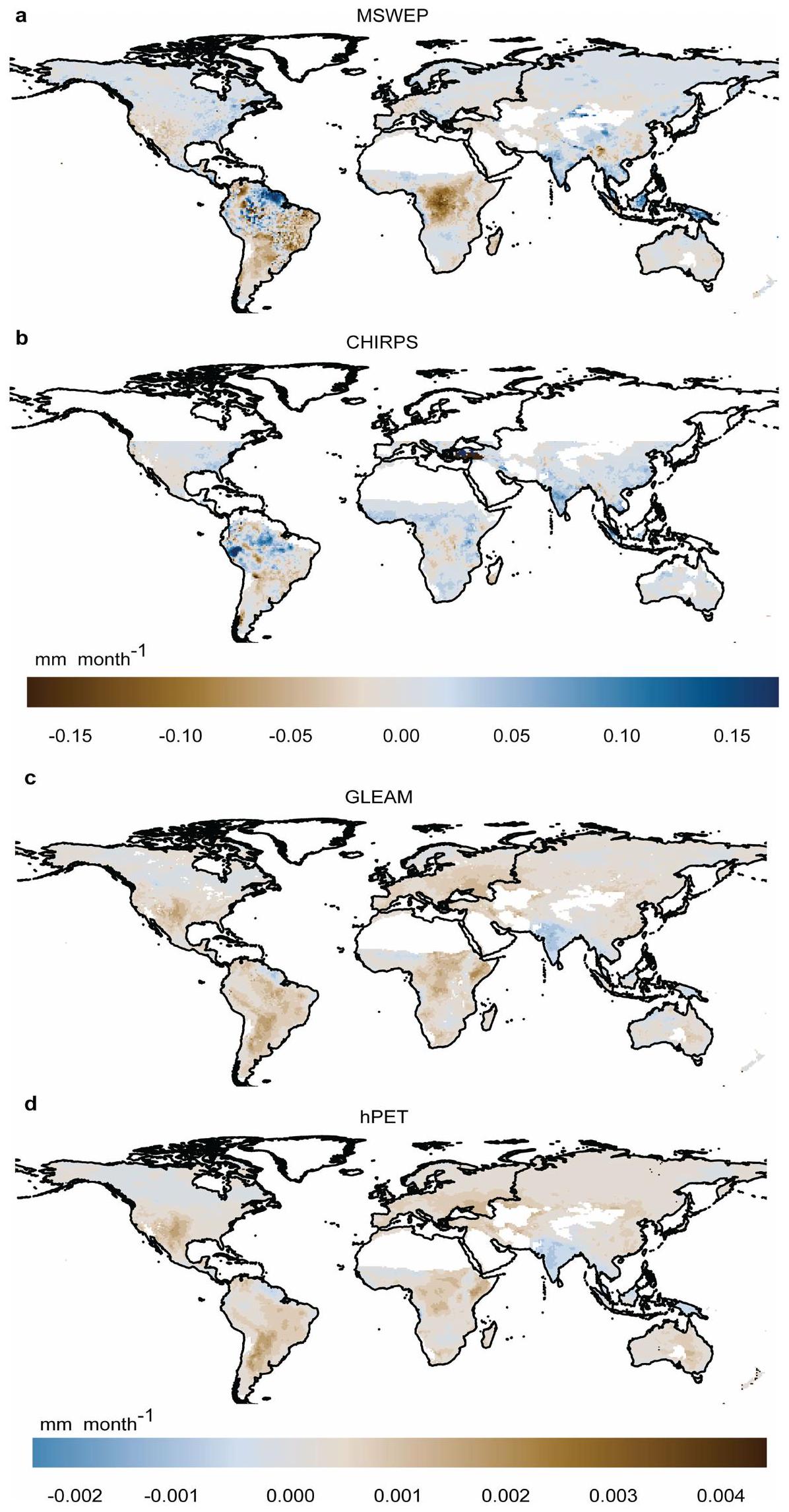 present the trends in monthly AED, derived from GLEAM and hPET datasets, respectively. Note that the CHIRPS dataset covers latitudes up to