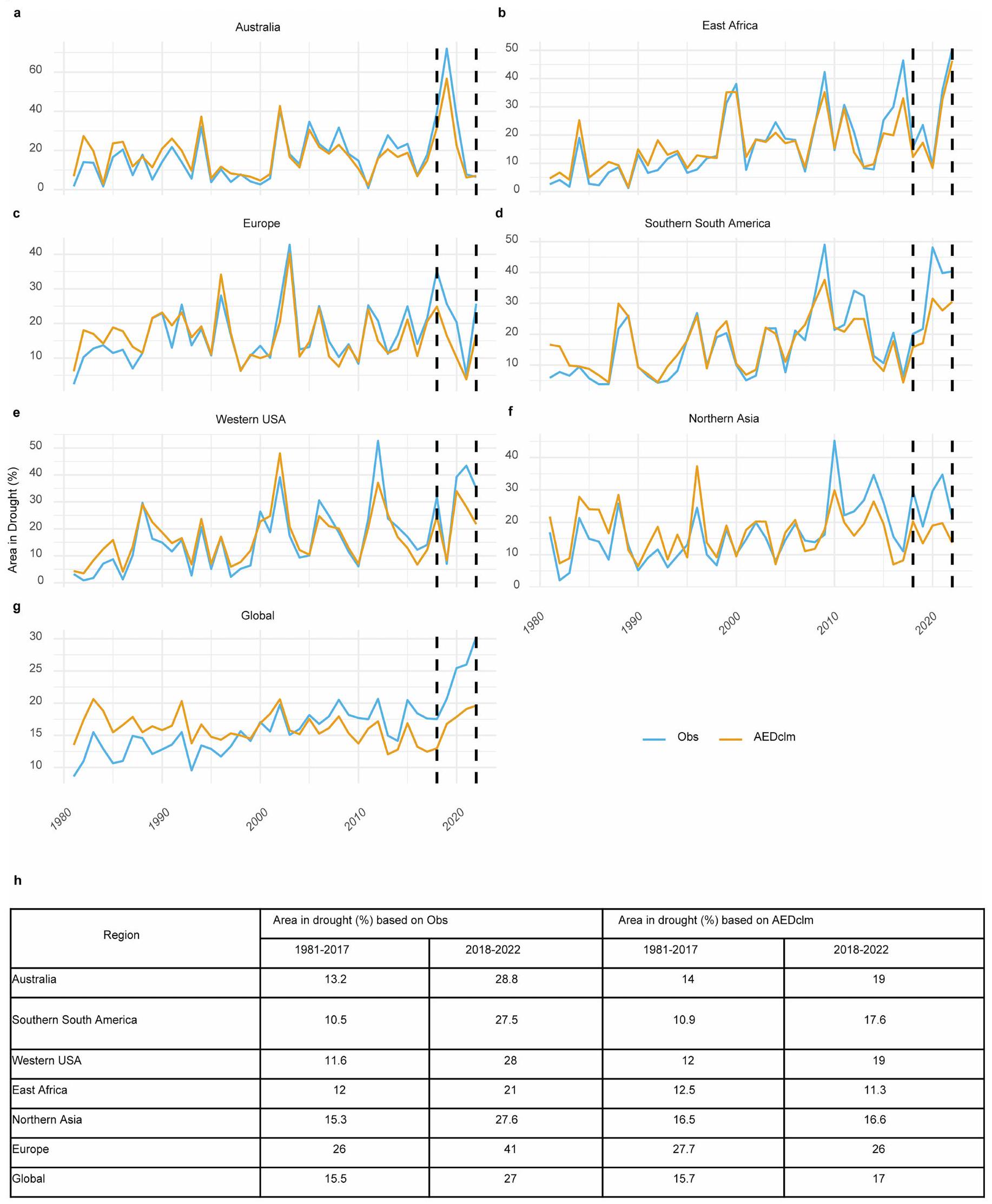 نسبة المناطق المتأثرة بالجفاف استنادًا إلى مؤشر SPEI المحسوب باستخدام هطول الأمطار المرصود و AED المناخي (AEDclm). تبرز الخطوط العمودية السوداء المتقطعة الفترة من 2018 إلى 2022. تلخص اللوحة h) نسبة المناطق المتأثرة بالجفاف خلال 2018-2022، مقارنة بالفترة 1981-2017، استنادًا إلى كل من البيانات المرصودة و AEDclm.