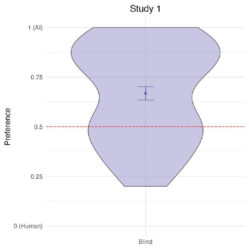 Response preference also followed the pattern of the two previous studies, such that AI responses were considered better at addressing the prompt than expert humans, . We once again found significant differences in participants’ response preferences by transparency condition, such that the preference for AI-generated responses was greater when participants were blind ( , ) rather than transparently exposed ( ) to the response author labels, , . In examining the extent of participants’ preferences for compassionate statements generated by AI v. human experts separately across blind and transparent conditions against a test value of 0.5 , we confirmed that AI responses were judged as better at addressing the prompt than the expert human responses to a greater extent in the blind, , , rather than transparent condition, .