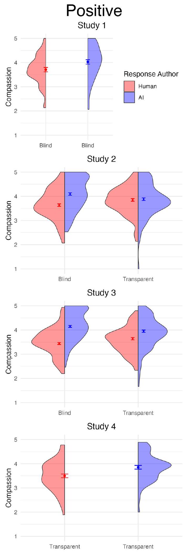In experiments 2 and 3, we randomly assigned participants to blind and transparent conditions, where they were ignorant and aware of the response author identity, respectively. In an aim to assess the AI advantage against the influence of source transparency, we confirmed that the AI advantage decreased when people knew the response authors’ identities. However, participants continued to rate AI responses as more compassionate than human responses even when they knew that the response was AI -authored. This pattern of findings is consistent with the existing literature surrounding the impact of source disclosure on people’s perceptions of AI-generated content, where the effectiveness of AI-generated content is lower when source identity is disclosed, even when its quality is evaluated as largely comparable to human responses . In short, people seem to prefer AI content more when they are unaware that it was made by AI.