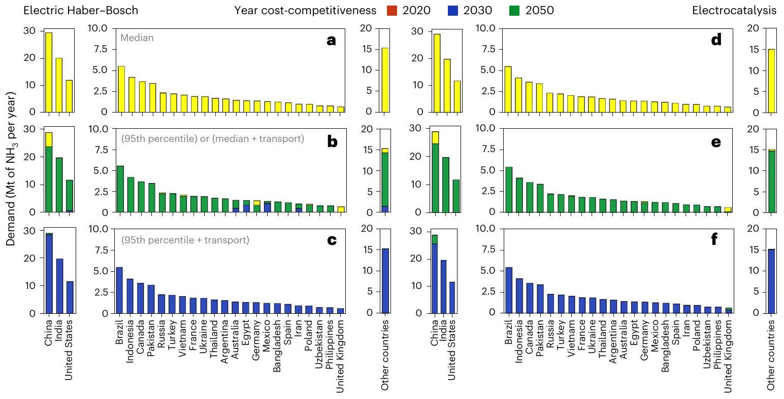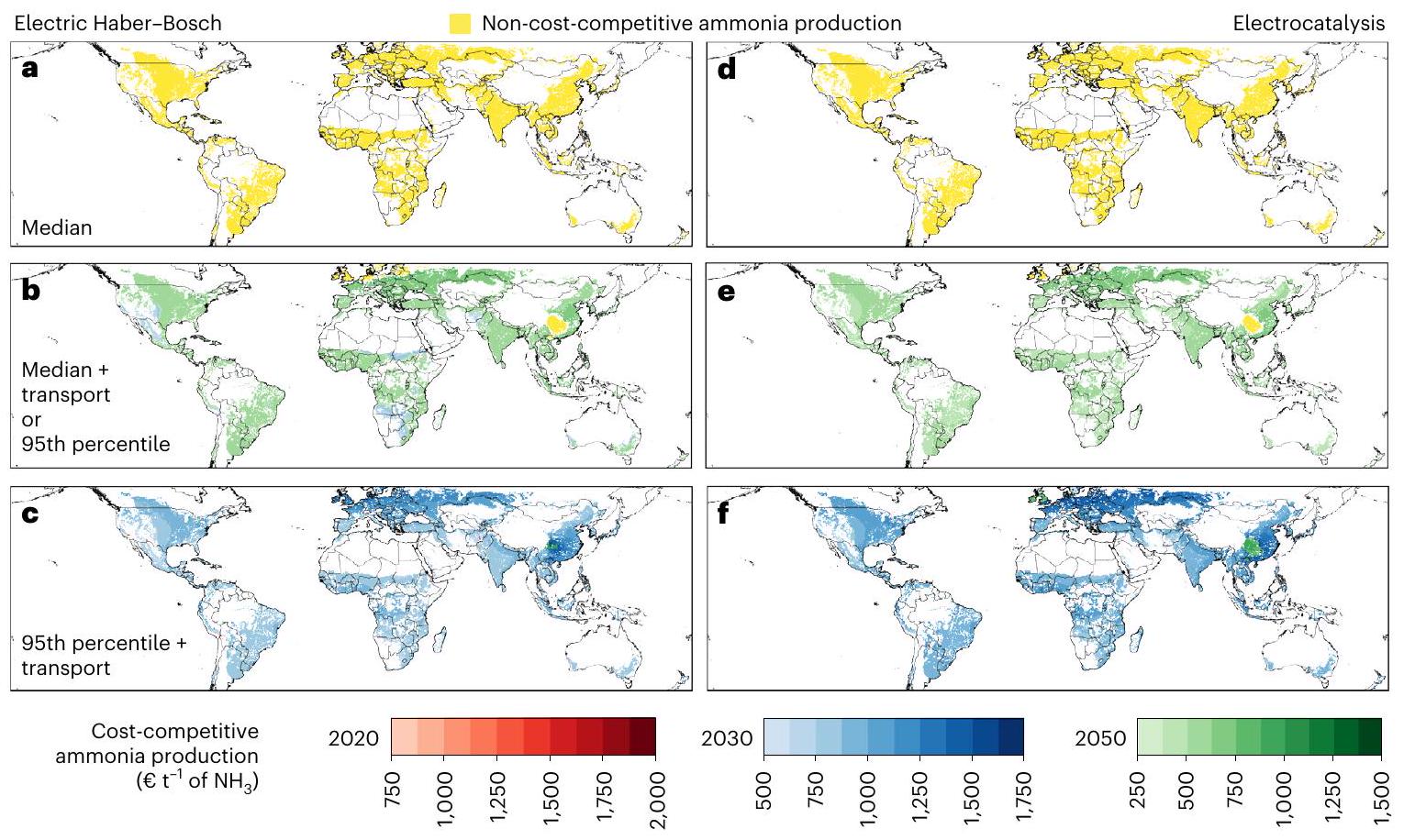 الإنتاج القائم على الوقود الأحفوري تحت أسعار السوق المنخفضة من الإنتاج المركزي واستبعاد تكلفة نقل الأمونيا. ب، ج، يتم تحقيق القدرة التنافسية من حيث التكلفة بناءً على عملية هابر-بوش الكهربائية للتطور التكنولوجي المتوقع في عام 2030 و2050 ومقارنةً بالتكلفة المتوسطة للإنتاج المجمعة مع تكلفة النقل (ما يعادل التكلفة في النسبة المئوية 95 لإنتاج الأمونيا) (ب) وتكلفة الإنتاج في النسبة المئوية 95 مع تكلفة النقل الإضافية (ج). هـ، و، يتم تحقيق القدرة التنافسية من حيث التكلفة بناءً على التحفيز الكهربائي اللامركزي للتطور التكنولوجي المتوقع في عام 2030 و2050 ومقارنةً بالتكلفة المتوسطة للإنتاج المجمعة مع تكلفة النقل (ما يعادل التكلفة في النسبة المئوية 95 لإنتاج الأمونيا) (هـ) وتكلفة الإنتاج في النسبة المئوية 95 مع تكلفة النقل الإضافية (و). تمثل البكسلات الملونة باللون الأصفر المناطق التي لا يكون فيها الإنتاج اللامركزي تنافسيًا من حيث التكلفة. القيم بالنسبة لـ