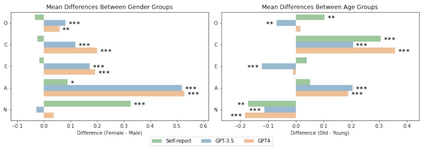 Specifically, past work indicates that LLMs are susceptible to stereotyping and bias with regard to demographic and geographic groups | 21, 33-37], likely reflecting groups’ representation in the underlying training data. At the same time, past work has shown differences in social media use and online self-expression across demographic groups, including age and gender [38-42]. While the past literature does not directly speak to differences in personality expression, the observed pattern of results would indicate that women and younger individuals tend to reveal more accurate information about their personalities online.