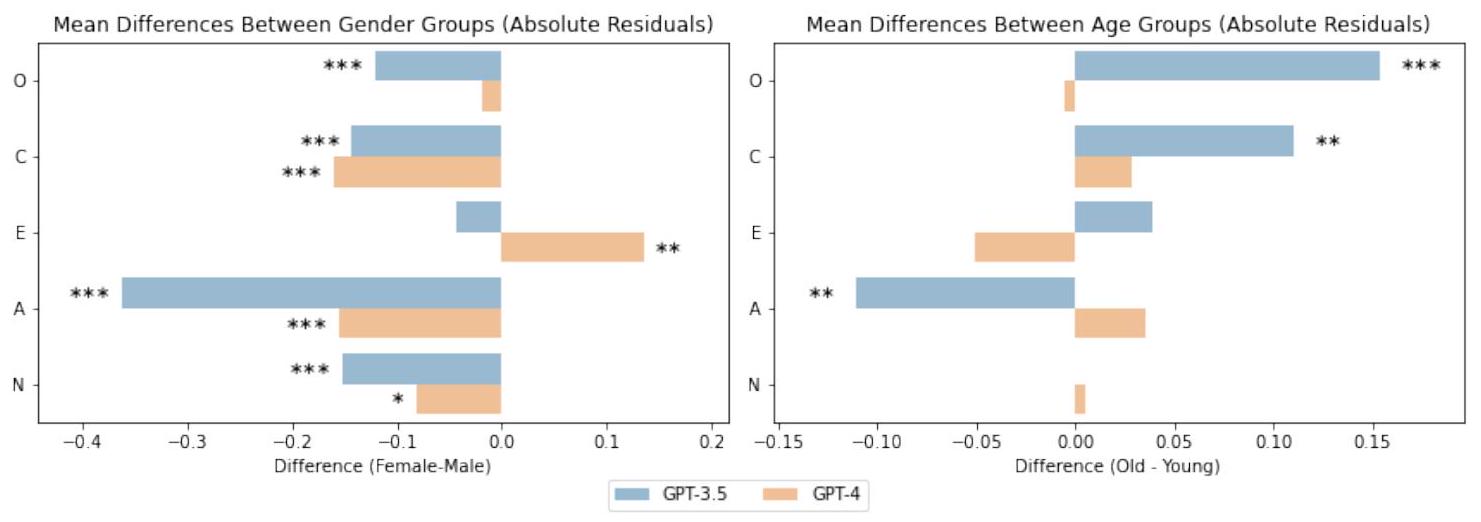 As before, we further explore these differences by analyzing age differences in the residuals between selfreported and inferred scores. Unlike in the analyses of gender, we found substantial inconsistency in the group differences between GPT-3.5 and GPT-4. While the inferences made by GPT-3.5 showed significantly larger absolute residuals for older users in Openness (