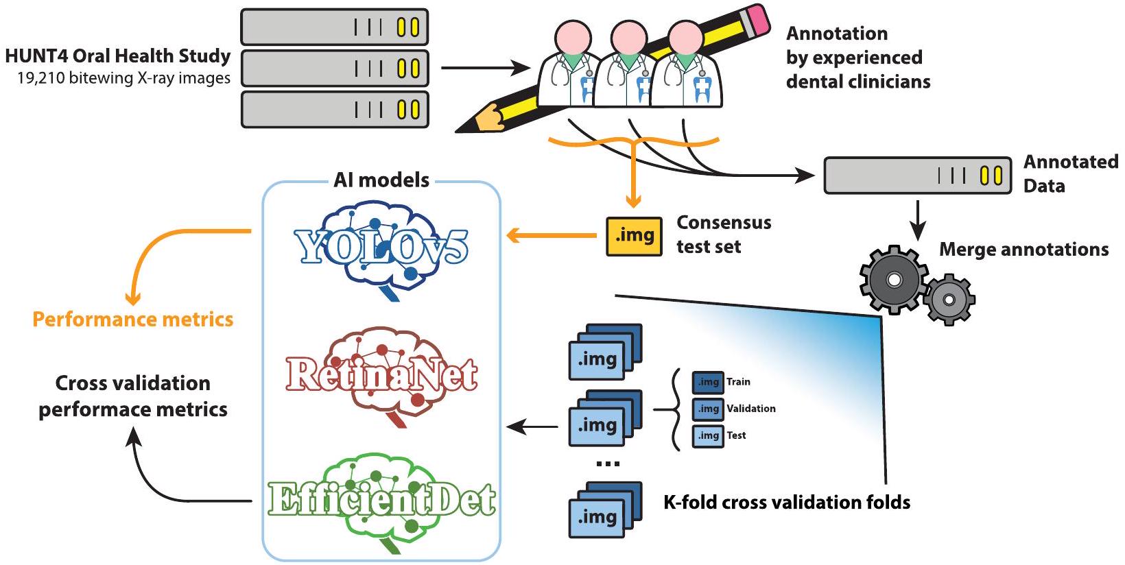 الخلفية يتطلب تشخيص تسوس الأسنان الفحص اليدوي لصور الأشعة السينية التشخيصية للمرضى، يليه فحص بصري واستكشاف للأجزاء السنية المحددة التي تحتوي على آفات محتملة. ومع ذلك، فإن استخدام الذكاء الاصطناعي، وخاصة التعلم العميق، لديه القدرة على المساعدة في التشخيص من خلال تقديم تحليل سريع ومعلوماتي لصور الأشعة السينية. الطرق تم وضع مجموعة بيانات تحتوي على 13,887 صورة أشعة سينية من دراسة HUNT4 لصحة الفم، وتمت الإشارة إليها بشكل فردي من قبل ستة خبراء مختلفين، واستخدمت لتدريب ثلاث هياكل مختلفة للكشف عن الأجسام باستخدام التعلم العميق: RetinaNet (ResNet50)، YOLOv5 (حجم M)، و EfficientDet (حجم D0 و D1). تم استخدام مجموعة بيانات توافقية تحتوي على 197 صورة، تم الإشارة إليها بشكل مشترك من قبل نفس الستة من أطباء الأسنان، للتقييم. تم استخدام نظام التحقق المتقاطع بخمسة أضعاف لتقييم أداء نماذج الذكاء الاصطناعي.