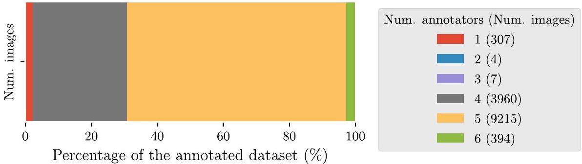 لأطباء الأسنان. إلى أفضل معرفتنا، هذه هي أكبر مجموعة بيانات تم تقديمها حتى الآن لمهمة تدريب نماذج كشف الكائنات لاكتشاف التسوس، متجاوزة حجم مجموعة البيانات الموصوفة في [11] بـ 3,000 صورة، وفي [14] بـ 3,686 صورة بالأبيض والأسود. تم تقديم استراتيجية جديدة لدمج التعليقات التوضيحية من عدة معلقين على نفس الصورة، مما أدى إلى إنشاء تعليقات توضيحية قوية للحقيقة الأساسية للتدريب من خلال دمج المعرفة المتخصصة لجميع المعلقين. بالإضافة إلى ذلك، تم التعليق على مجموعة اختبار تتكون من 197 صورة بشكل مشترك من قبل جميع المعلقين من خلال اتفاق بالإجماع. تم استخدام مجموعة اختبار الإجماع لمقارنة أداء النماذج مقابل أداء المعلقين الفرديين، مما يسمح بتقييم فائدة النماذج من خلال المقارنة مع قاعدة بيانات المعرفة البشرية المتخصصة.