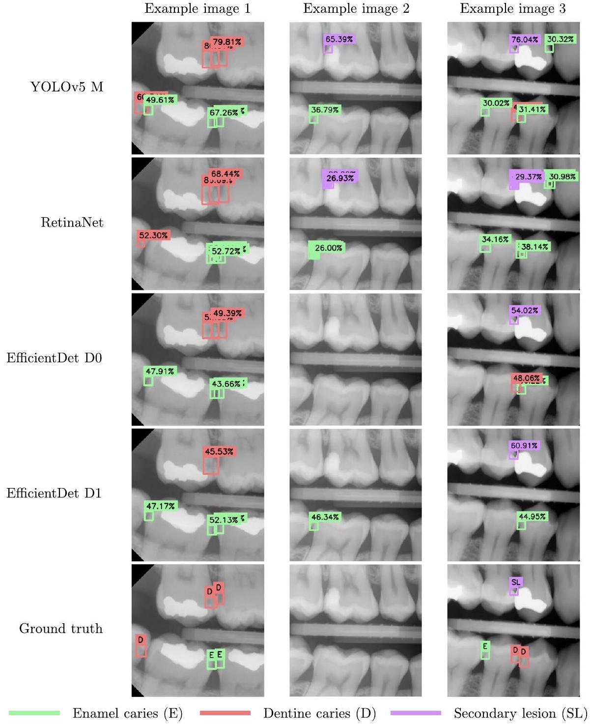 لذا، في هذه الدراسة قمنا بتدريب الهياكل المذكورة أعلاه في الكشف وتصنيف تسوس المينا، تسوس العاج، والآفات الثانوية، في صور الأشعة السينية. ثم تمت مقارنة النماذج مع المعلقين البشريين لاختبار فرضيتنا. بالإضافة إلى ذلك، تم اقتراح خط أنابيب معالجة جديد لدمج تعليقات الكشف عن الأجسام متعددة المراقبين، استنادًا إلى نماذج المزيج الغاوسي.
