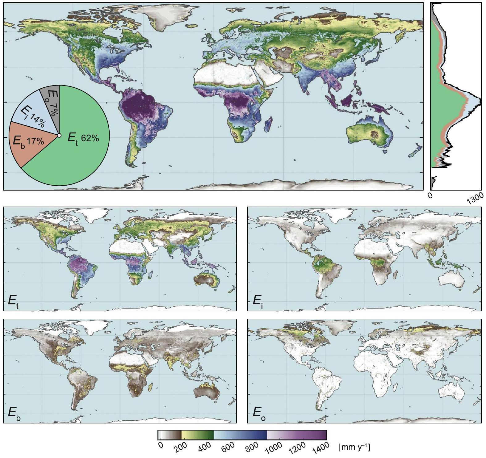 تظهر التحلل العالمي لمكونات تدفقها في الرسم البياني الدائري والملف العرضي على اليمين. المتوسطات طويلة الأجل لكل من المكونات (أسفل): النتح