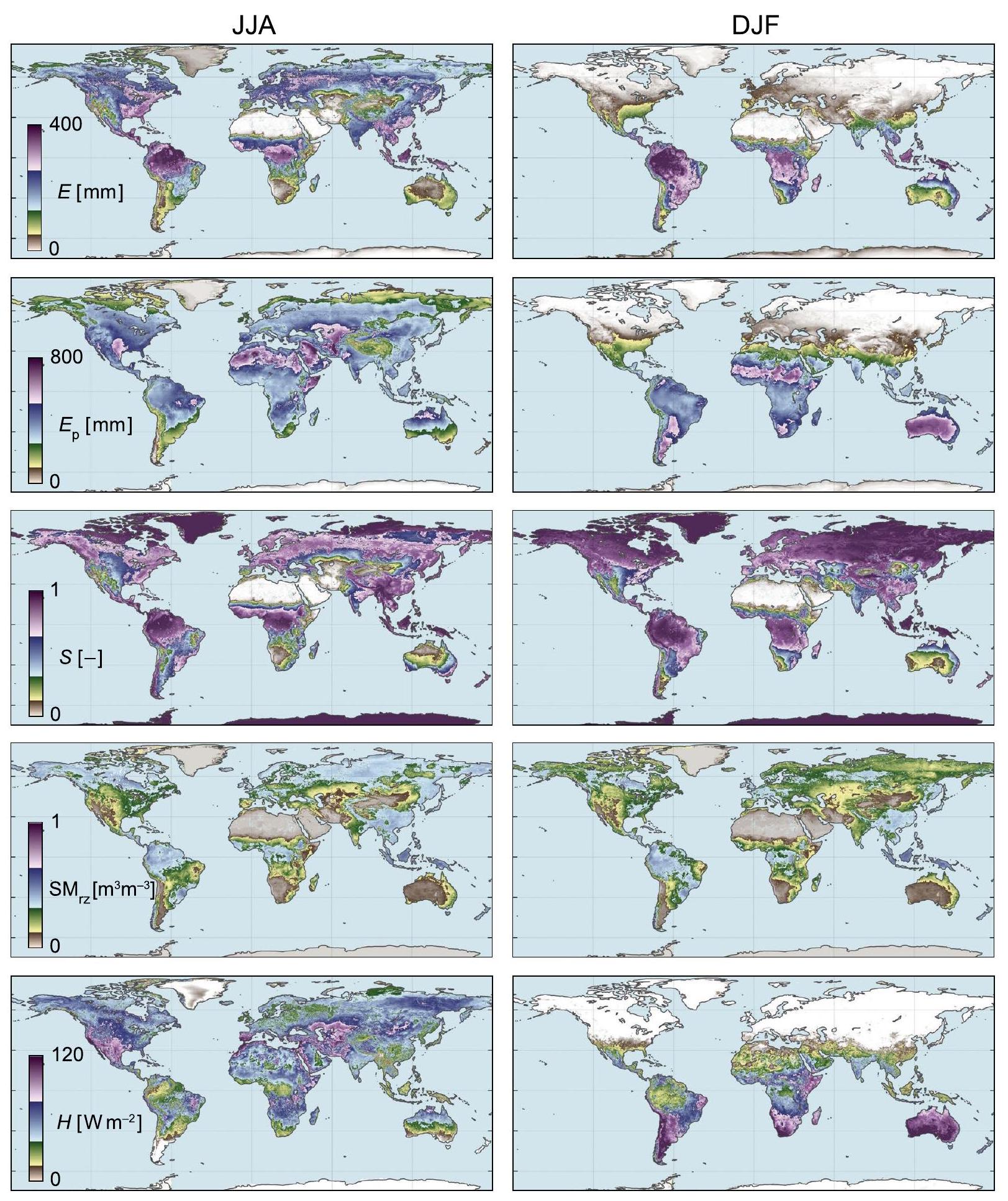 The seasonal dynamics of some of the key variables from GLEAM4 are portrayed in Fig. 3. The sub-panels showcase global multi-year (1980-2023) mean