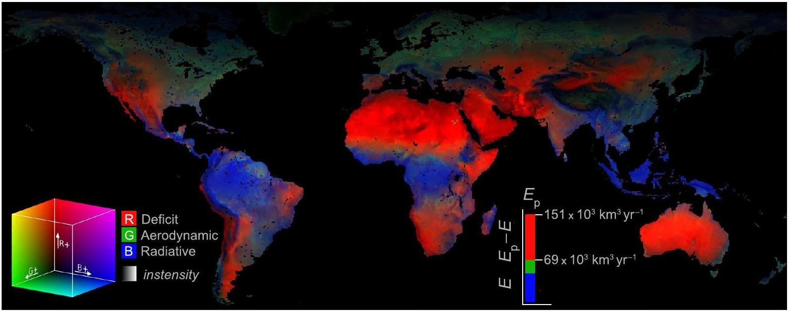 (blue tones), which is high due to the high incoming radiation and low albedo of rainforests. Globally, the atmosphere demand for water, or
