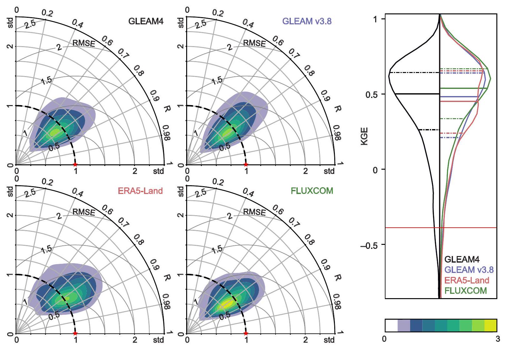 final sample of 473 sites and 2511 years of data. Figure 7 compares the overall performance of the four datasets GLEAM4 and the other three datasets (i.e., GLEAM v3.8a, ERA5-Land, and FLUXCOM) in simulating . Results are illustrated through Taylor density diagrams and violin plots of Kling-Gupta Efficiency (KGE), both displaying the distribution of the validation metrics that are calculated per site. The normalised standard deviation (std) in the Taylor diagrams indicates a mild tendency of all datasets (except for ERA5-Land) to underestimate the variability of