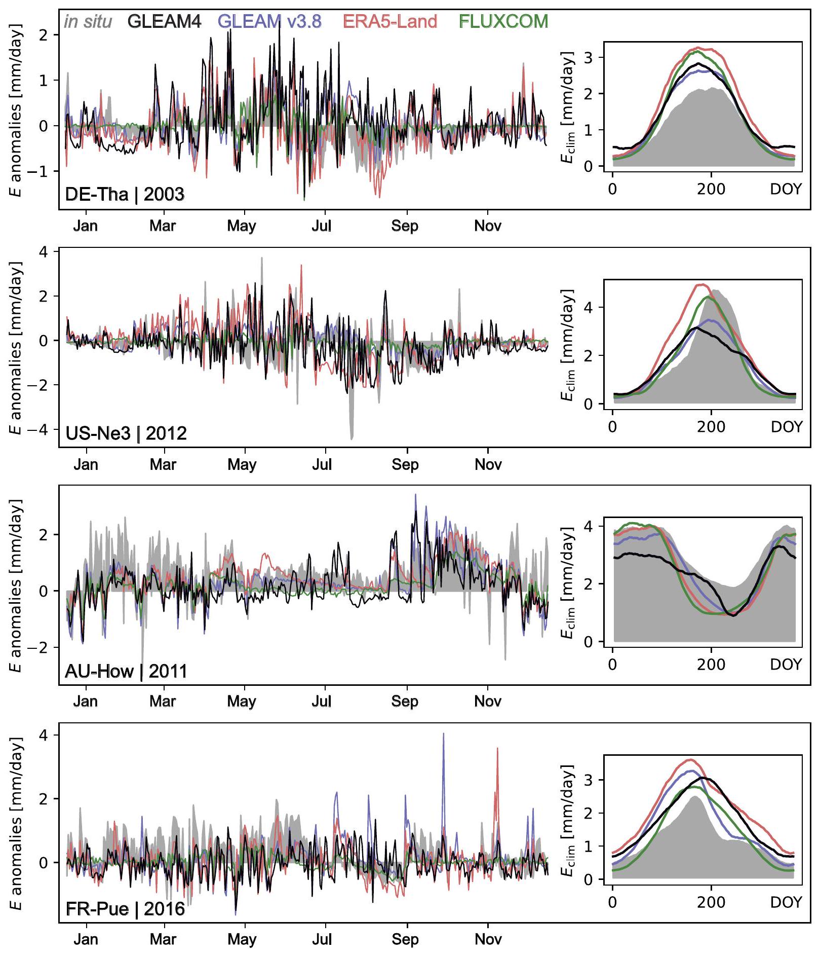 . This could relate to differences in land cover from the tower footprint to the coarser-resolution pixels, and it is also influenced by biases in the input data used by each of the models. Nonetheless, all datasets capture the timing of the seasonal cycle, but overestimate its amplitude in DE-Tha and FR-Pue, while they show a larger divergence in general and a tendency to underestimate in both US-Ne3 and AU-How. Overall, GLEAM4 aligns well with observed seasonal cycles, and despite the heterogeneous performance across sites, it reproduces