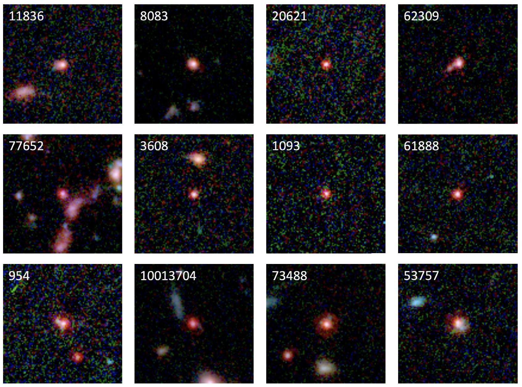 الشكل 2 يظهر صور NIRCam (Rieke et al. 2023) للأجسام النشطة ذات الخطوط العريضة المختارة (كل صورة مصغرة هيفي الحجم). في معظم الحالات، تكون هذه الأهداف مضغوطة جدًا، وغالبًا ما تهيمن عليها نقطة مصدر مركزية، كما هو متوقع بالنسبة لمصادر الأشعة السينية من النوع 1. بعض منها لها ألوان حمراء ومظهر يشبه النقطة مشابه لـ