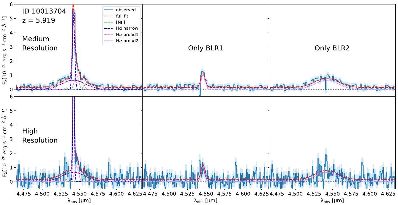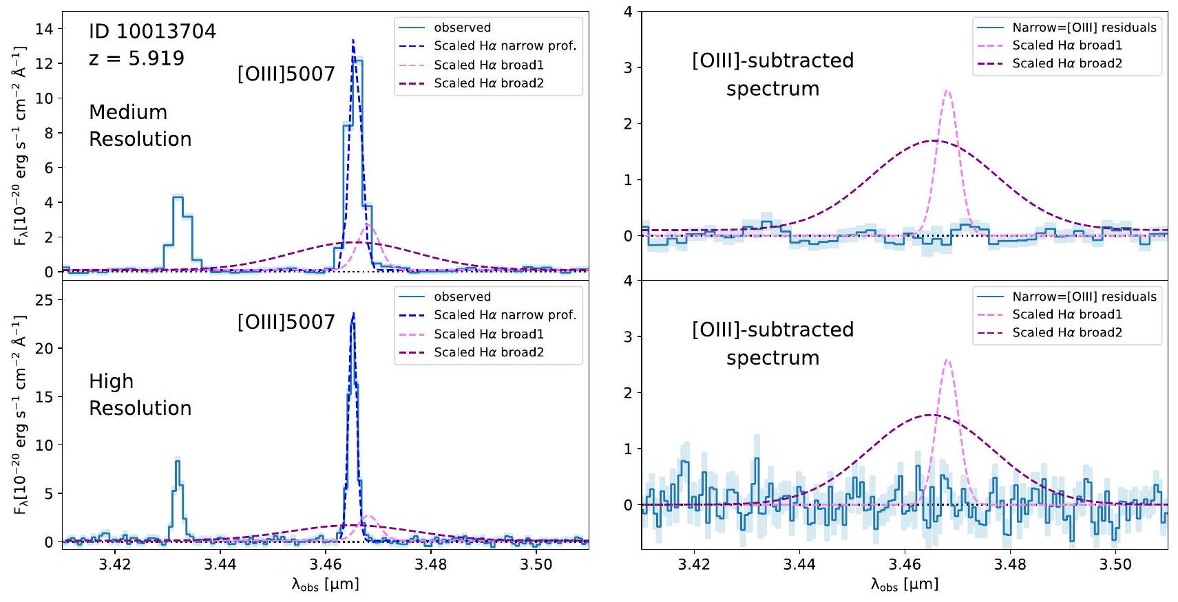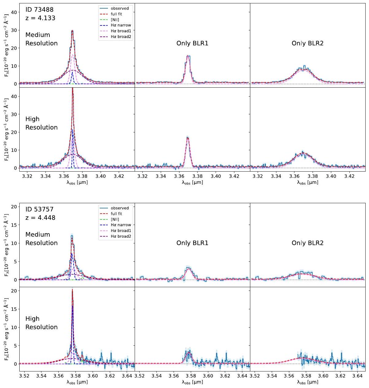 بالنسبة للعديد من الأجسام، فإن الحاجة إلى BLR واضحة إلى حد كبير، مع وجود مكون عريض بارز ومتقارب تقريبًا.كما هو الحال في AGNs من النوع الأول الكلاسيكي. ومع ذلك، في الحالات التي تكون فيها الأجنحة العريضة لخطوط بالمر أضعف أو غير متناظرة، يمكن أن تكون مرتبطة أيضًا بتدفقات مجرية، وفي الواقع، كشفت دراسة JADES عن عدد من التدفقات المجرية من خلال فحص ملفات خطوط الانبعاث (كارنياني وآخرون 2024). ومع ذلك، يجب أن يُرى الغاز المؤين عالي السرعة في المجرة المضيفة، خاصة إذا كان مرتبطًا بالتدفقات، بشكل أكثر وضوحًا في ملف خطوط المعادن، خاصة الانتقال القوي [OIII]5007. في الواقع، إن الإثارة الأعلى للغاز في التدفقات، إلى جانب حقيقة أن التدفقات المجرية تكون عادةً أكثر غنى بالمعادن من المجرة المضيفة، تجعل عادةً خط [OIII] أقوى من كلاهما. و حتى في التدفقات الخارجة عند الانزياح الأحمر العالي (هولدن وتادهونتر 2023؛ كارنياني وآخرون 2015؛ مارشال وآخرون 2023). لذلك، فإن شرط تحديد منطقة الانبعاث الواسعة هو أنه يجب عدم اكتشاف المكون الواسع في خط [OIII].