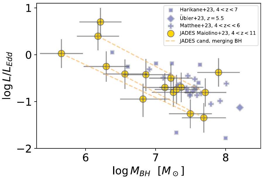 while our new JADES AGNs are shown with large golden circles. Also in this case, the vertical, dashed orange lines show the candidate merging BHs.
