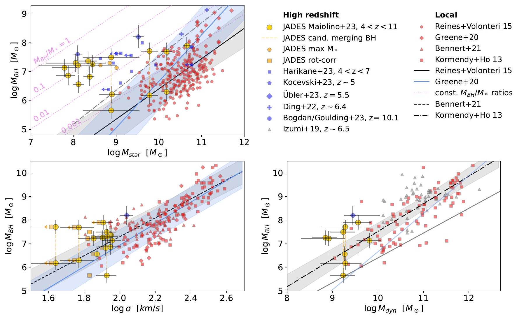 The relation at high-z is, unfortunately, less populated than the relation (due to the lack of information to derive the dynamical mass in a number of galaxies). The larger scatter of the relative to the relation is probably partly a consequence of the additional uncertainties in deriving . However, the interesting result is that the broadline AGNs found in JADES are not strongly offset from the local relation, in contrast with the case of the relation. Broad-line AGNs at are generally scattered around the local relation. There is a tendency for more AGNs being offset above the local relation, but not by more than two times the local dispersion, and consistent with the deviations seen in other local galaxies. Part of the better agreement may be a consequence of using here the Kormendy & Ho (2013) relation (which, as was discussed above, is more adequate in this case), instead of the Reines & Volonteri (2015) relation. However, even considering only the Kormendy & Ho (2013) local relation, it remains true that the offset is much larger on the than on the relation.