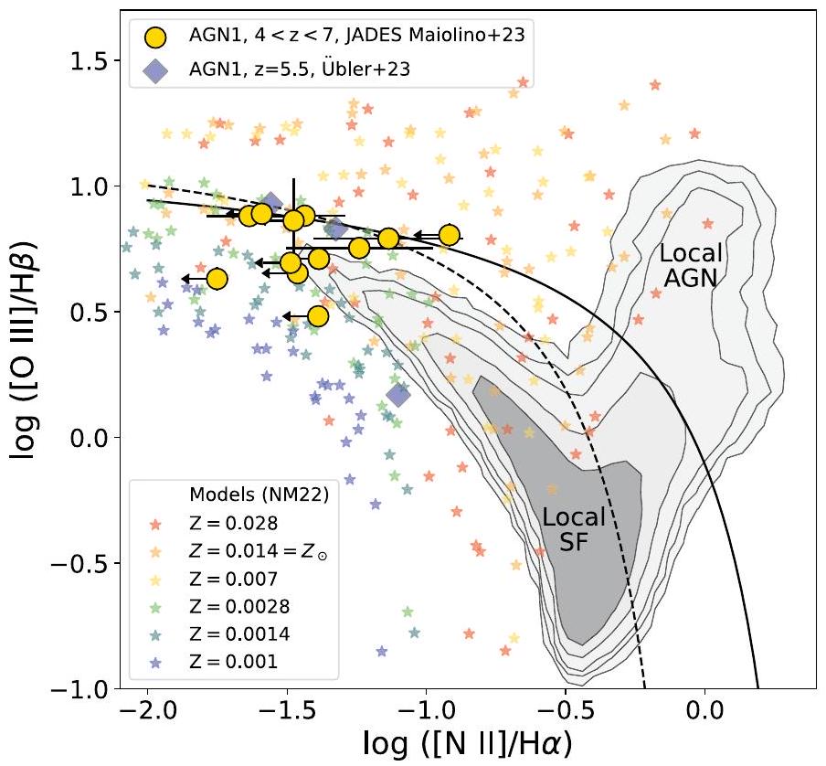 Fig. 8. [NII]-BPT diagram. Contours show the distribution of galaxies in the local Universe from SDSS (DR7), showing the AGN sequence (right) and the star-forming sequence (left). The solid and dashed lines are the corresponding dividing lines from Kewley et al. (2001) and Kauffmann et al. (2003), respectively. The JADES broad-line AGNs presented in this paper are shown with golden circles, while blue diamonds show the values obtained by Übler et al. (2023) for an AGN at . Stars show predictions by AGN photoionisation models from Nakajima & Maiolino (2022) colour-coded by metallicity.