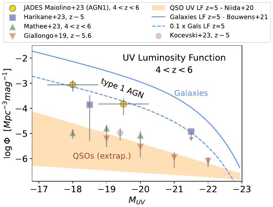 Fig. 9. UV luminosity function of galaxies at from Bouwens et al. (2021) (solid blue line) and inferred contribution of galaxies hosting broad-line (type 1) AGNs with , inferred by us from the JADES survey (golden circles). Results from other surveys are also reported, as is indicated in the legend. The dashed blue line shows the galaxy luminosity function scaled downward by a factor of ten and fitting the JADES points. The orange-shaded region shows the range of possible extrapolated luminosity functions for QSOs from Niida et al. (2020).