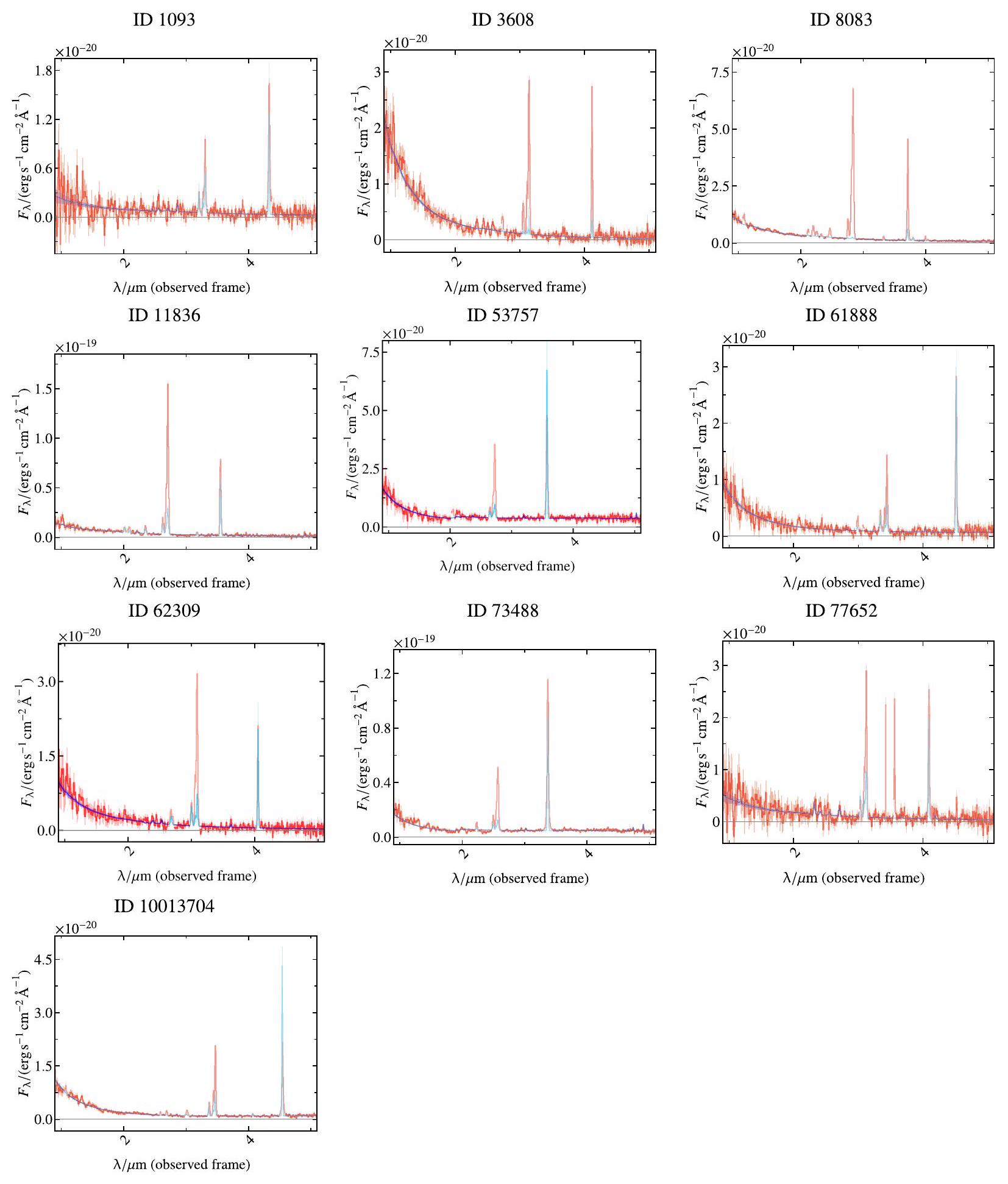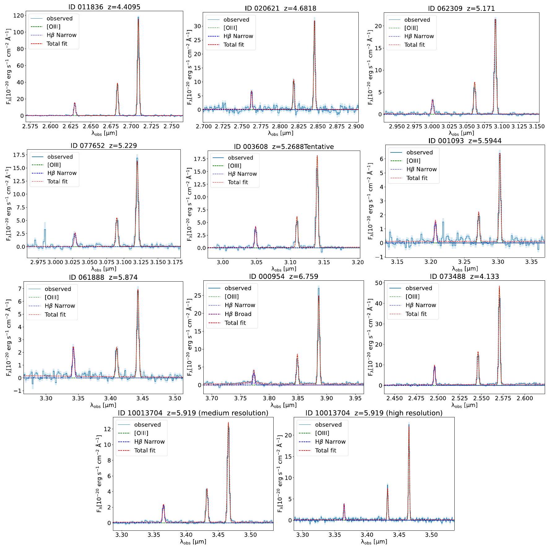 تظهر الشكل 1 المنطقة الطيفية حوللـ 12 من AGNs التي تم تحديدها حديثًا. من أجل البساطة، في معظم الحالات نعرض فقط طيف G395M، وهو الطيف الذي يظهر النطاق الواسعيتم رؤيتها بشكل أوضح، بينما بشكل عام تكون طيف الشبكة عالي الدقة (إذا كان متاحًا لـلديهم ملف متسق، على الرغم من كونه أكثر ضوضاءً. الاستثناء الوحيد هو ID073488 الذي نعرض له طيف G395H مباشرة لأنه يحتوي على مستوى عالٍ جداً (لكننا سنعرض أيضًا طيف G395M المقابل في القسم التالي). في الشكل 1، يتم ملاءمة جميع الأطياف مع ضيق واحد وعريض واحدالمكون، كما هو موضح أدناه؛ ومع ذلك، بالنسبة لثلاثة أشياء سنناقش موضوعًا أكثر تعقيدًاتوافق الملف الشخصي في القسم التالي.
