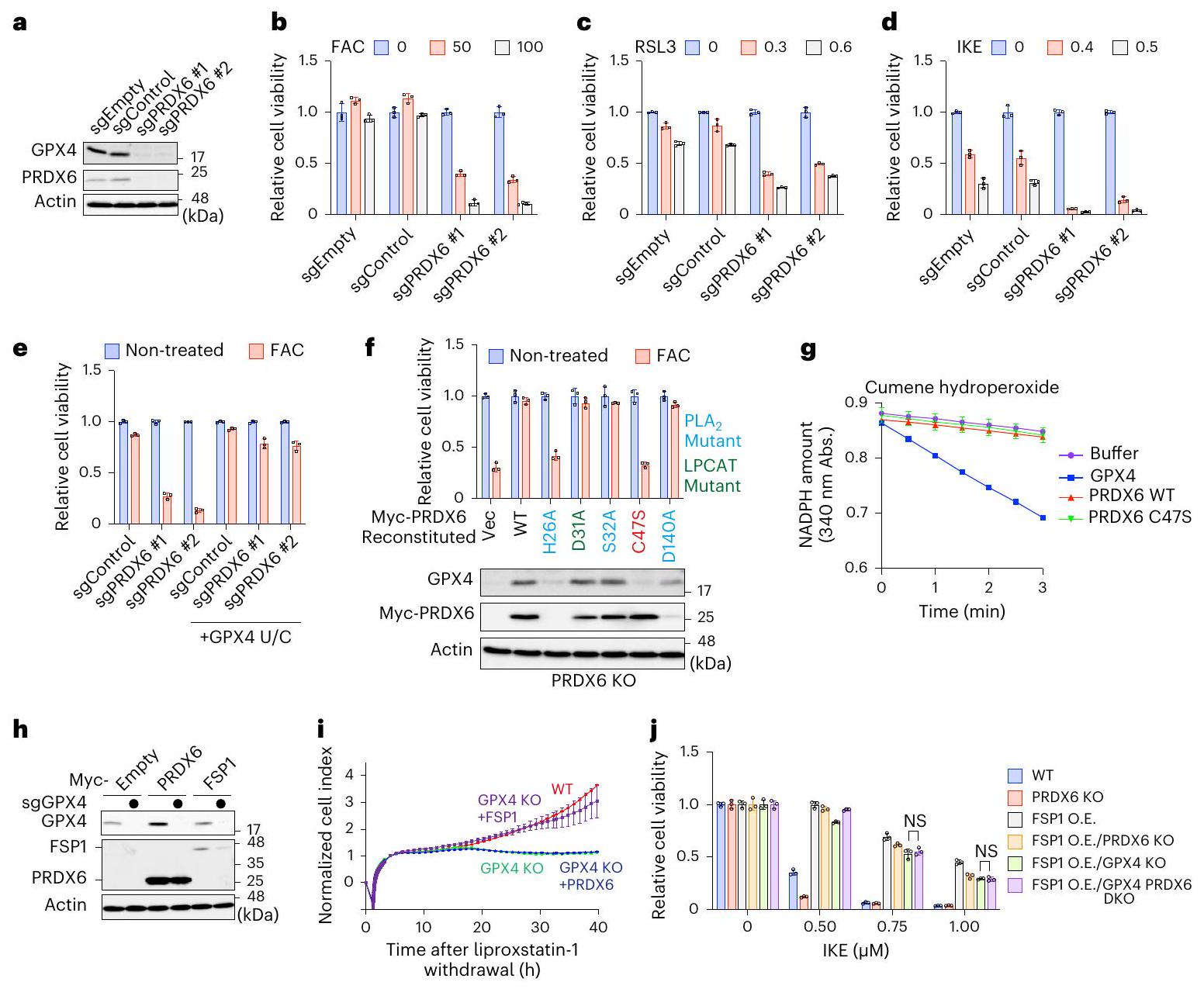 ينتمي PRDX6 إلى عائلة إنزيمات مضادات الأكسدة PRDXs.. من بينها، يتميز PRDX6 بخصيصة فريدة حيث يحتوي على بقايا سيستين محفوظة واحدة (C47)، في حين تحتوي الأعضاء الأخرى من العائلة على اثنتينيظهر PRDX6 ثلاث أنشطة إنزيمية: نشاط بيروكسيداز الجلوتاثيون (GPX) (C47)، والفوسفوليباز A2 نشاط (H26 و S32 و D140) ونشاط LPCAT (D31) (تظهر البقايا الأساسية لكل نشاط بين قوسين)لفحص النشاط المطلوب للحفاظ على وفرة GPX4، قمنا بإعادة تكوين خلايا PRDX6 KO باستخدام PRDX6 WT أو الطفرات (الشكل 2f). على الرغم من أن الطفرة H26A فشلت في استعادة مستويات GPX4 بسبب ضعف التعبير، إلا أن الطفرات S32A و D140A استعادتهما. لذلك، استنتجنا أن نشاط الفوسفوليباز A2 غير ضروري. وجدنا أن الطفرة C47S فشلت أيضًا في استعادة تعبير GPX4 (الشكل 2f). كما أن الطفرة C47S حسّست الخلايا ليس فقط تجاه الحديد ولكن أيضًا تجاه الفيروبتوسيس التقليدي (الشكل 2f والشكل الإضافي 3e، f). وقد أشارت التقارير السابقة إلى أن PRDX6 يظهر نشاط GPX عند C47 (المرجع 33)؛ ومع ذلك، تم الإبلاغ عن نتائج متناقضة أيضًا.وجدنا أن PRDX6 المنقى ليس له نشاط GPX (الشكل 2g والشكل الإضافي 3g)، مما يشير إلى أن السيستين المحفوظ في PRDX6 له وظيفة مختلفة عما كان يُعتقد سابقًا. بعد ذلك، تساءلنا عما إذا كان PRDX6 يقلل من الهيدروبيروكسيدات الدهنية في الخلايا بشكل مباشر. أدى الإفراط في التعبير عن PRDX6 إلى زيادة تعبير GPX4 في خلايا WT (الشكل 2h)، مما يؤكد أن PRDX6 ضروري لتعبير GPX4. حيث أن فقدان GPX4 يجعل الخلايا حساسة بشدة للفيروبتوز.قمنا بزراعة خلايا GPX4 KO في وسط ثقافي يحتوي على مثبط الفيروبتوزيس ليبروكستاتين-1. أدى غسل ليبروكستاتين-1 إلى تثبيط نمو خلايا GPX4 KO (الشكل 2i). أعاد التعبير عن FSP1، الذي يثبط الفيروبتوزيس بشكل مستقل عن GPX4، تكاثر خلايا GPX4 KO، كما تم الإبلاغ عنه سابقًا.; ومع ذلك، فإن تعبير PRDX6 فشل في استعادة تكاثر خلايا GPX4 KO (الشكل 2i). علاوة على ذلك، لم يقلل تعبير PRDX6 من تراكم الهيدروبيروكسيدات الدهنية في خلايا GPX4 KO (بيانات موسعة الشكل 3h)، مما يشير بقوة إلى أن PRDX6 لا يثبط الهيدروبيروكسيد الدهني أو الفيروبتوسيس بشكل مباشر؛ بل إنه يثبطهما عن طريق زيادة كمية GPX4. كما قمنا أيضًا بإنشاء خلايا ذات تعبير مفرط لـ FSP1 (O.E.)/GPX4 و PRDX6 مزدوجة النقص (DKO) لتأكيد نتائجنا (بيانات موسعة الشكل 3i). لم يؤد فقدان PRDX6 إلى زيادة الفيروبتوسيس الناتج عن IKE في خلايا FSP1 O.E./GPX4 KO (الشكل 2j)، مما يدعم فرضيتنا بأن PRDX6 يثبط الفيروبتوسيس بشكل غير مباشر من خلال الحفاظ على تعبير GPX4.