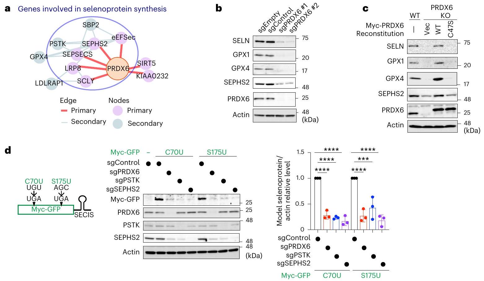 بعد ذلك، قمنا بتفكيك الآلية الكامنة وراء زيادة تعبير GPX4 التي يسببها PRDX6. لم نجد أي اختلافات واضحة في مستويات mRNA لـ GPX4 بين خلايا PRDX6 KO وخلايا WT (الشكل 4a من البيانات الموسعة)، كما أن مثبطات البروتيازوم أو الليزوزوم لم تستعد مستويات GPX4 في خلايا PRDX6 KO (الشكل 4b،c من البيانات الموسعة). أظهر تحليل علم الأحياء الجيني غنى عوامل تخليق السيلينوبروتين (الشكل 2a من البيانات الموسعة). علاوة على ذلك، وجدنا أن أدوات قاعدة بيانات التوازي غير المتحيزكما أشار إلى وجود ارتباط وظيفي قوي بين PRDX6 والجينات المشاركة في تخليق السيلينوبروتين (الشكل 3أ). لذلك، استنتجنا أن PRDX6 يشارك في تخليق السيلينوبروتين. في الواقع، أدى حذف PRDX6 إلى تقليل تعبير السيلينوبروتينات الأخرى، بما في ذلك السيلينوبروتين N (SELN)، GPX1 وSEPHS2 (الشكل 3ب). إن Cys47 المحفوظ في PRDX6 ضروري لتعبير السيلينوبروتينات لأن تعبير السيلينوبروتين تم إنقاذه من خلال إعادة تعبير PRDX6 WT، ولكن ليس من طفرات C47S، في خلايا PRDX6 KO (الشكل 3ج). علاوة على ذلك، أدى فقدان PRDX6 إلى تقليل كمية السيلينوبروتينات في عدة خطوط خلايا سرطانية بشرية (بيانات موسعة الشكل 4د)، مما يشير إلى أن دور PRDX6 محفوظ عبر العديد من أنواع السرطان.