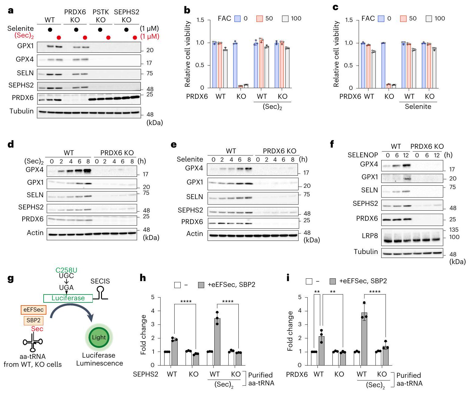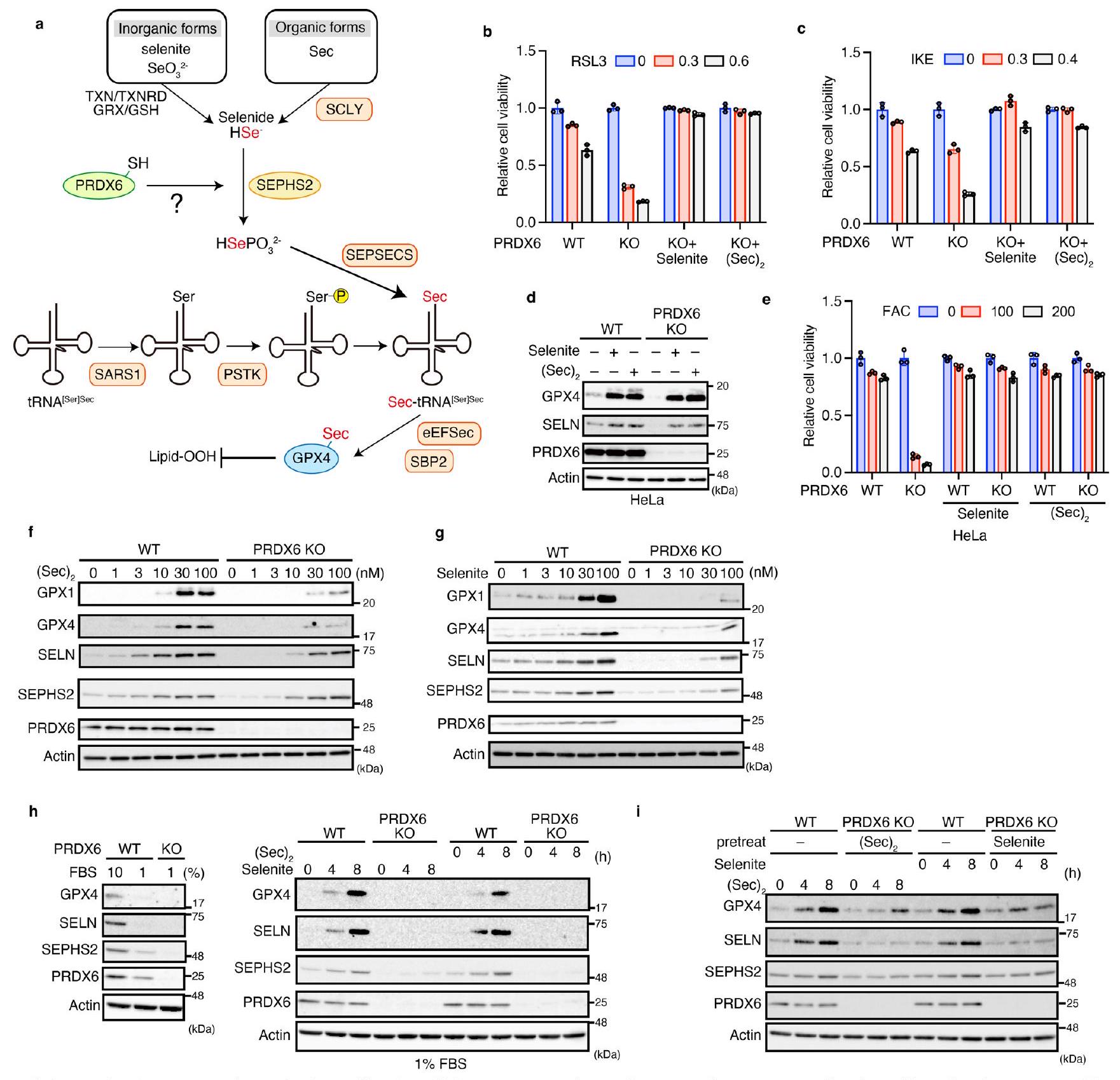 lysates from control or PRDX6 KO cells cultured for 32 h in the presence of the indicated concentrations of or sodium selenite , WT or PRDX6 KO cells were incubated for 24 h with FBS in the presence of liproxstatin-1. Then, cells were treated with or 100 nM sodium selenite for the indicated times. Cell lysates were analyzed by immunoblotting. i, PRDX6 KO cells were preincubated for 36 h with or 40 nM sodium selenite. Then, WT or PRDX6 KO cells pretreated with selenium were exposed to 50 nM or 200 nM sodium selenite for the indicated periods and the lysates were analyzed by immunoblotting. Data are representative of two ( ) or three ( ) independent experiments. Viability data (b, c, e) are presented as the mean s.d. of three biological replicates.