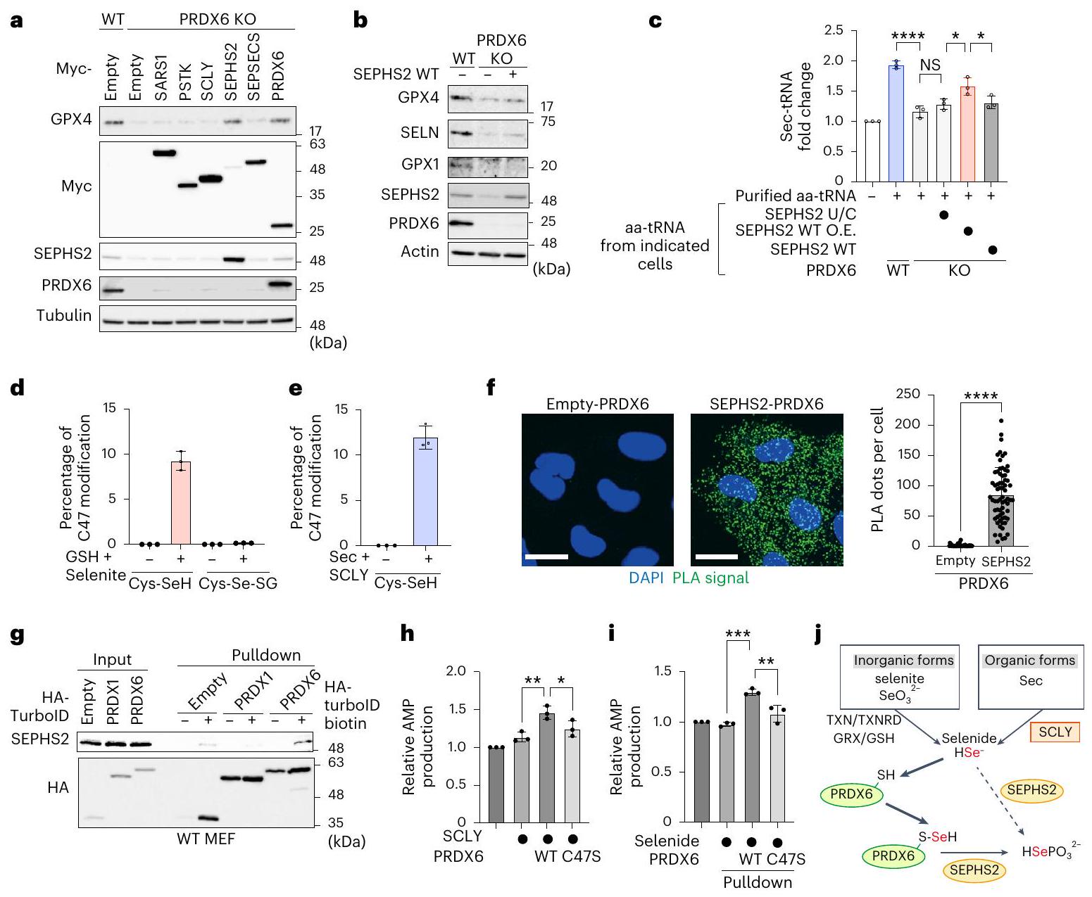 يتم توصيل السيلينيد إلى SEPHS2 ويتم فوسفوريته لإنتاج سيلينوفوسفات لـ Sec-tRNA.تركيبنظرًا لأن السيلينوفوسفات هو منتج غير مستقرقمنا بتقييم إنتاج AMP، وهو منتج ثانوي لعملية تخليق السيلينوفوسفات، لتقييم تسريع تخليق السيلينوفوسفات بواسطة PRDX6. استخدمنا بروتين SEPHS2 U/C المؤتلف الذي يحتفظ بنشاط الإنزيم لتخليق السيلينوفوسفات.بدلاً من SEPHS2 WT لأن تعبير SEPHS2 WT منخفض للغاية (الشكل 5a) ومن الصعب تنقيته. في تفاعل تخليق السيلينوفوسفات الذي يتم فيه استخدام تحلل Sec بواسطة SCLY كمصدر للسيلينيوم، أدى إضافة PRDX6 WT إلى زيادة فعالة في التخليق لـ سيلينوفوسفات، بينما لم يفعل C47S (الشكل 5h). عندما تم تحضين PRDX6 WT أو C47S مسبقًا مع السيلينيد لتوليد معقد PRDX6-selenide كمصدر للسيلينيوم، تسارع PRDX6 WT إنتاج AMP بواسطة SEPHS2 U/C (الشكل 5i). بشكل جماعي، تشير هذه البيانات إلى أن PRDX6 يسهل Sec-tRNAالتركيب من خلال العمل ك-protein ناقل للسيلينيد (الشكل 5j).