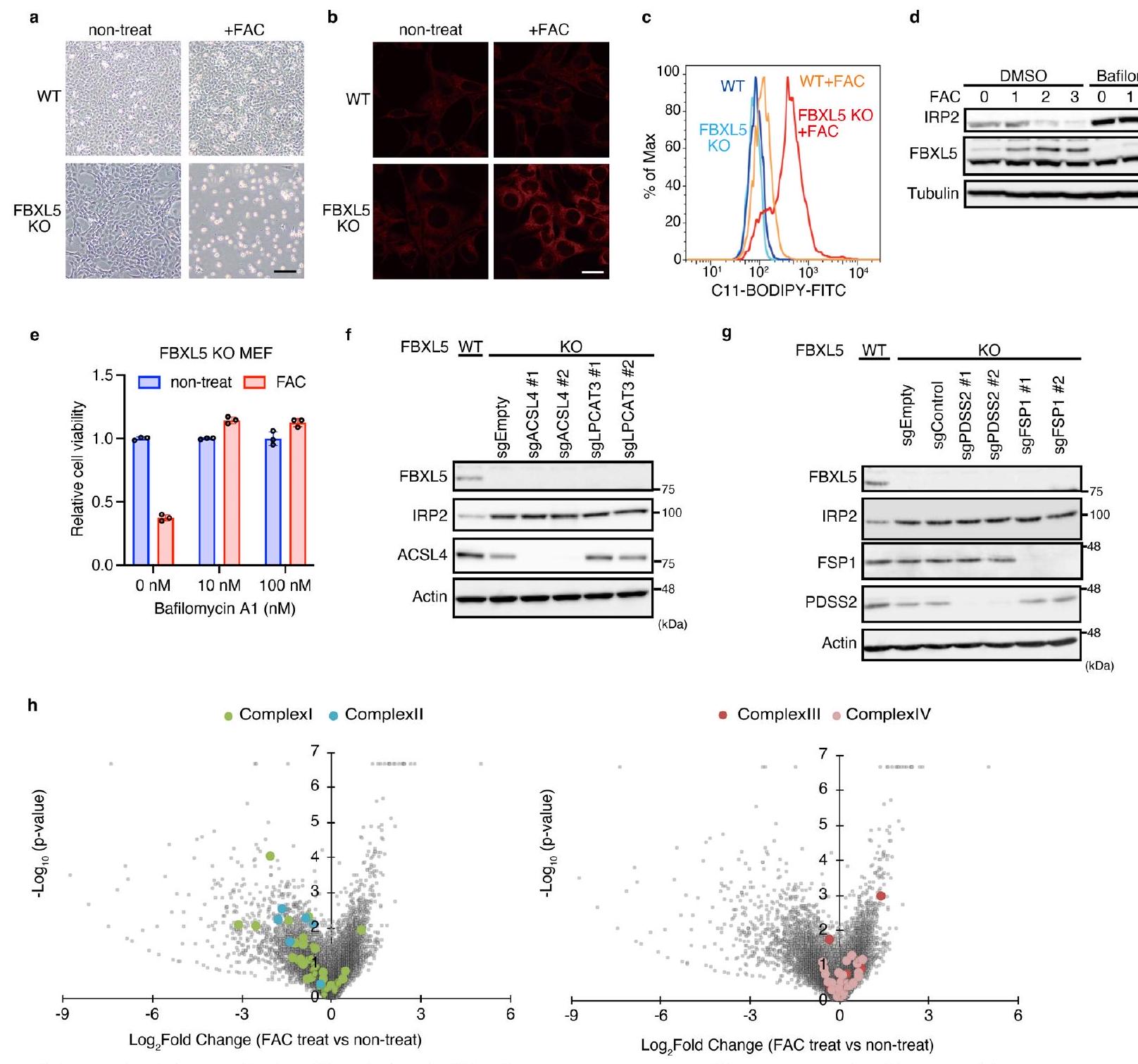 البادئة ‘فيرو’ تشير إلى أن الفيروبتوزيس يجب أن يتم تصنيفه كشكل من أشكال سمية الحديد؛ ومع ذلك، في معظم دراسات الفيروبتوزيس، لا يتم تحفيز موت الخلايا عن طريق إدارة الحديد. بل، يتم تحفيزه عن طريق تثبيط المزيلات لهيبيروكسيد الدهون مثل مثبط GPX4 RSL3 أو مثبط ناقل السيستين إيراستين.لإعادة تحليل الفيروبتوز من منظور سمية الحديد ولتحديد منظمات جديدة، قمنا بتطوير نظام لتحفيز الفيروبتوز يعتمد فقط على إضافة الحديد. يعمل بروتين تنظيم الحديد 2 (IRP2) ونظام بروتين F-box والغني بالتكرارات الليوسينية 5 (FBXL5) كمنظم رئيسي لتوازن الحديد الخلوي من خلال قمع امتصاص الحديد وزيادة تخزين الحديد من خلال تحلل IRP2 بواسطة FBXL5 (المراجع 19-21). لذلك، لتحفيز سمية الحديدقمنا بإزالة FBXL5 من الخلايا الليفية الجنينية للفئران (MEFs) باستخدام نظام CRISPR-Cas9 (الشكل 1a). أدى العلاج بالسترات الأمونيوم الحديدي (FAC) إلى قتل خلايا FBXL5 المعطلة (KO) بشكل انتقائي من خلال زيادة تركيز الحديد داخل الخلايا، كما تم الكشف عنه بواسطة مجس فلوري محدد لـ (الشكل 1ب والشكل البياني الموسع 1أ،ب) يُعتقد أن الفيروبتوزيس يتم تحفيزه بواسطة الهيدروبركسيد من الأحماض الدهنية غير المشبعة (PUFAs) في غشاء الخلية بواسطة الحديد النشط بالأكسدة.كشف صبغ BODIPY 581/591 C11 عن زيادة في الهيدروبيروكسيد في خلايا FBXL5 KO المعززة بالحديد (الشكل 1c من البيانات الموسعة). بدا أن موت خلايا FBXL5 KO الناتج عن الحديد يحدث من خلال الفيروبتوزيس لأنه تم منعه بواسطة مثبط الفيروبتوزيس ليبروكستاتين-1 (الشكل 1b). لتحديد الجينات المشاركة في الفيروبتوزيس الناتج عن الحديد، قمنا بإجراء دراسة جينومية شاملة.
