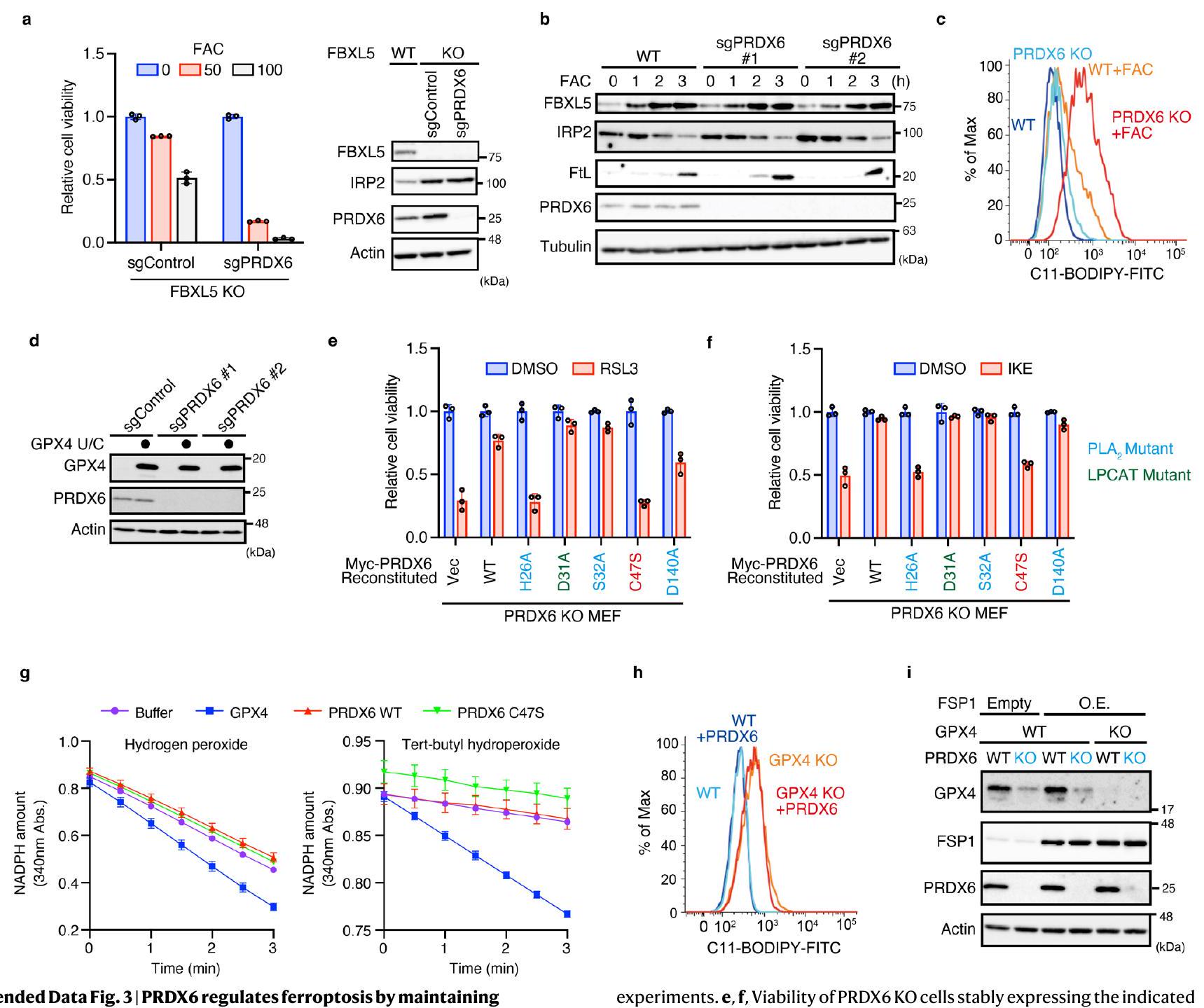 أظهر تحليل علم الأحياء الجيني لمثبطات الفيروبتوز الناتجة عن الحديد أن عوامل تخليق السيلينوبروتين كانت المجموعة الأكثر غنى (الشكل 2a من البيانات الموسعة). قائمة المثبطات ذات الثقة العالية أثارت احتمال أن فقدان عوامل تخليق السيلينوبروتين يجعل الخلايا أكثر حساسية للفيروبتوز الناتج عن الحديد (الشكل 1d). من بين السيلينوبروتينات، تم تصنيف المنظم الرئيسي للفيروبتوز GPX4 بشكل عالٍ كمثبط (الشكل 2b من البيانات الموسعة). لذلك، اشتبهنا في أن منظمات جديدة لـ GPX4 قد تكون مدرجة في قائمة المثبطات لدينا (الشكل 2c من البيانات الموسعة)، وأجرينا فحصًا ثانويًا باستخدام وفرة GPX4 كقراءة (الشكل 2d من البيانات الموسعة). بشكل غير متوقع، وجدنا أن حذف PRDX6 قلل بشكل كبير من تعبير GPX4 (الشكل 2d من البيانات الموسعة)، وهو ما أكدناه باستخدام نوعين مختلفين من RNA الدليلية (gRNAs) (الشكل 2a). من المدهش أن فقدان PRDX6 جعل خلايا FBXL5 KO (الشكل 3a من البيانات الموسعة) وأيضًا خلايا النوع البري (WT) (الشكل 2b) أكثر حساسية للفيروبتوز الناتج عن الحديد، في حين أن حذف PRDX6 لم يكن له تأثير على توازن الحديد لأن استقرار FBXL5 الناتج عن FAC وتدهور IRP2 كان مشابهًا لذلك في خلايا WT (البيانات الموسعة