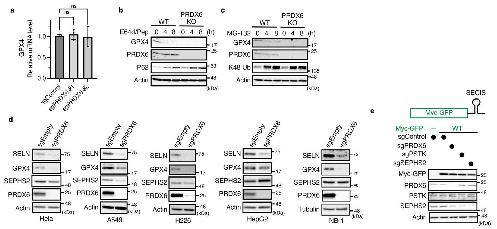 a, Quantification of GPX4 mRNA levels by RT-qPCR. Data are expressed as the mean s.d of three biological replicates. ns; not significant; (sgControl vs. sgPRDX6 #1 = 0.9523; sgControl vs. sgPRDX6 #2 = 0.9607); one-way ANOVA. b, c, Immunoblot analysis of lysates from control or PRDX6 KO cells incubated for 4 or 8 h in the presence of E64d/pep or MG-132 .