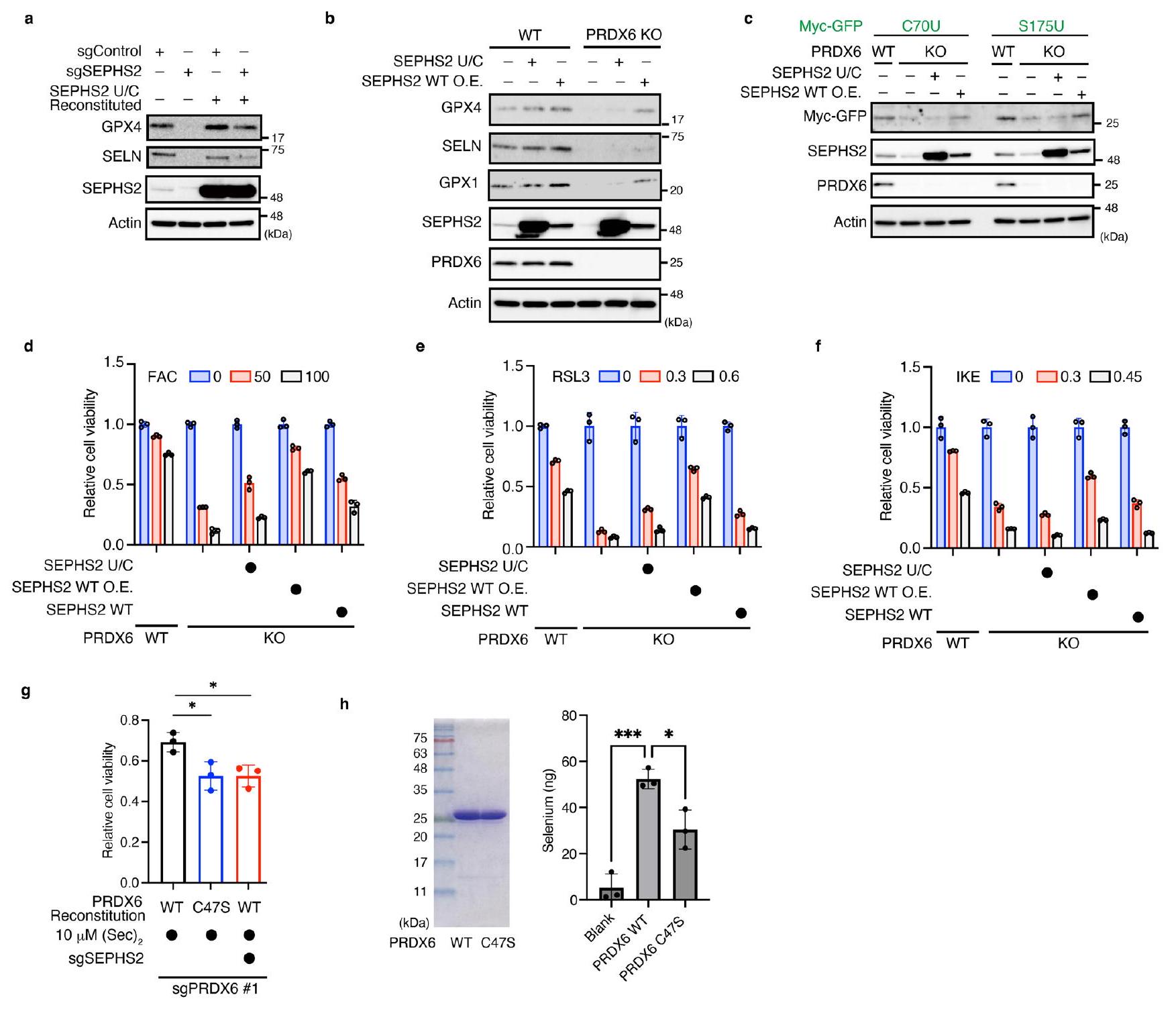 data are presented as the mean s.d. of three biological replicates. g, Viability of the indicated cells treated for 48 h with and liproxstatin- . Viability data are presented as the mean s.d. of three biological replicates. * PRDX6 WT vs. C47S = 0.0243; WT vs. sgSEPHS2 = 0.0238 ; one-way ANOVA.h, Coomassie-stained SDS-PAGE gel showing the recombinant PRDX6 WT or C47S mutant used for ICP-MS analysis. ICP-MS analysis of the amount of selenium bound to recombinant PRDX6 WT or C47S. Data are presented as the mean s.d. of three independent experiments. , *** ; one-way ANOVA.
