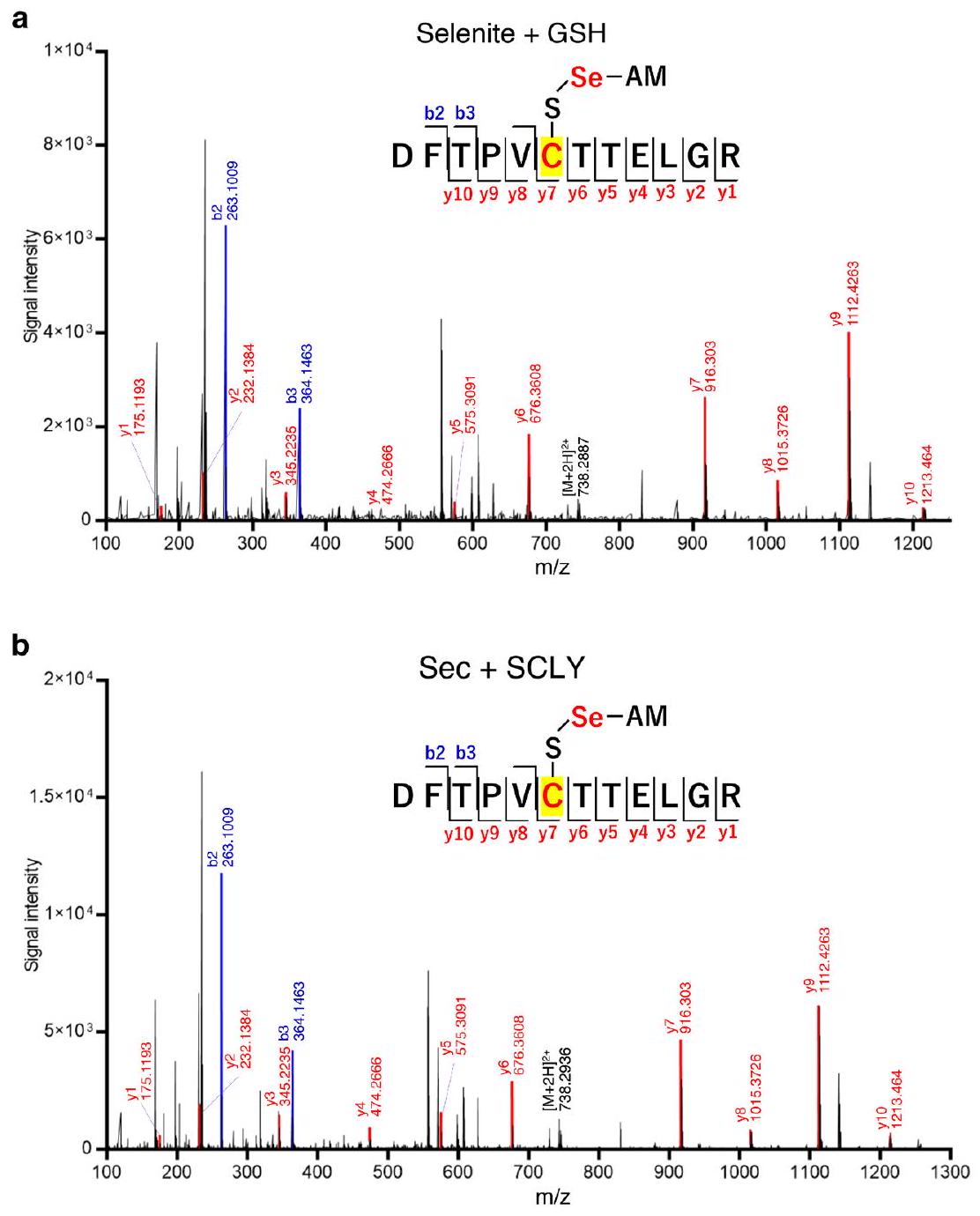 نظرًا لرد فعله العالي، كان يُعتقد أن السيلينيد يجب أن يرتبط ببروتين ناقل غير محدد من خلال بقايا السيستين لنقل فعال إلى SEPHS2 (المراجع 11، 16). إضافة فائض من (Sec)كان سامًا للخلايا؛ ومع ذلك، وجدنا أن PRDX6، الذي يعتبر C47 حاسمًا فيه، يثبط (Sec)السُميّة (الشكل 6g من البيانات الموسعة). بالنظر إلى أن C47 من PRDX6 يلعب أيضًا دورًا حاسمًا في التخليق الفعال للبروتينات السيلينومية (الأشكال 2f و3c)، فمن المحتمل جدًا أن يكون PRDX6 ناقلًا محتملًا للسيلينيد. أظهر تقرير سابق أن الرودانيز يشكل برسيلينيد (-S-SeH) عند بقايا السيستين في وجود السيلينيت وGSH.. لذلك، قمنا بتربية بروتينات PRDX6 WT أو C47S المعاد تركيبها مع السيلينيت وGSH، تلاها الكشف عن السيلينيوم المرتبط بـ PRDX6 بواسطة مطيافية الكتلة المتصلة بالتحريض (ICP-MS) (الشكل التمديدي 6h). وجدنا أن PRDX6 WT يرتبط بالسيلينيوم بشكل أكثر فعالية من الطفرة C47S. بعد ذلك، قمنا بإجراء تحليلات مطيافية الكتلة لتوصيف وسيط PRDX6-selenium بشكل أكبر. أظهرت النتائج أن C47 من PRDX6 يشكل رابطة برسيلينيد عند التفاعل مع GSH والسيلينيت، وكذلك مع SCLY وSec (الشكل التمديدي 7). علاوة على ذلك، وجدنا أن حوالي 10% من PRDX6 C47 شكلت رابطة برسيلينيد في تفاعل مدته 5 دقائق مع السيلينيت وGSH، أو مع SCLY وSec (الشكل 5d,e). بروتينات ناقلة للسيلينيد