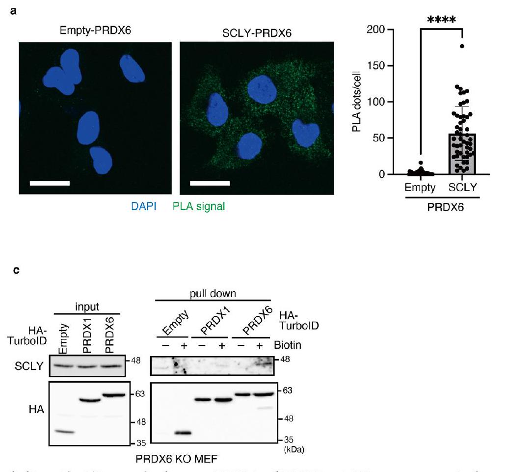 a, The physical association between PRDX6 and SCLY was detected in a PLA assay. Scale bars, . Data are representative of three independent experiments. Quantification of the PLA dots is also shown. Data are presented as the mean s.d. [ cells (Empty-PRDX6), cells (SCLY-PRDX6) examined], ;