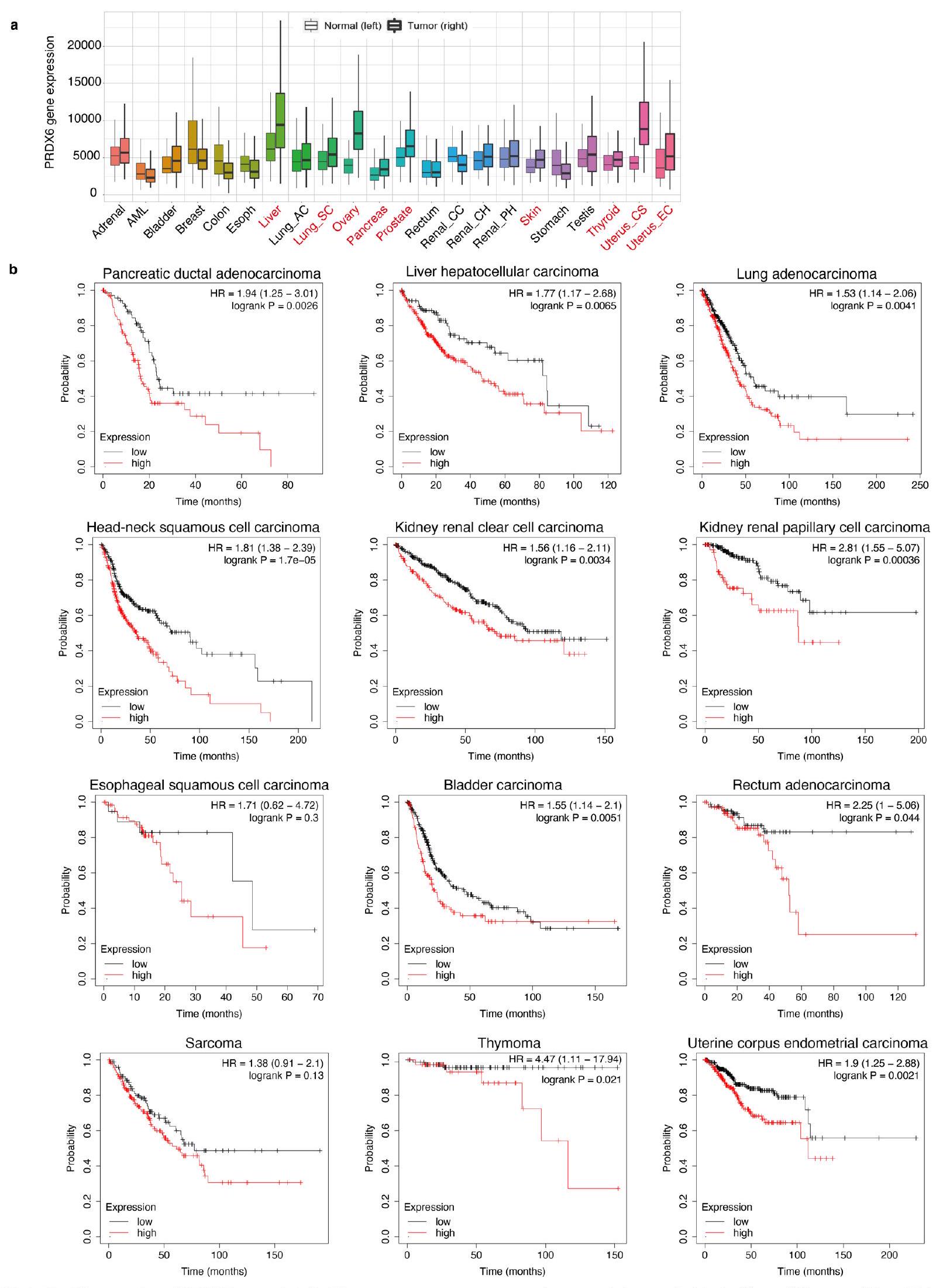 compared to normal tissue and with significant differences (Mann-Whitney U test) are marked in red ( ). b, Kaplan-Meier survival curves comparing cancer samples showing high PRDX6 expression with samples showing low PRDX6 expression (curves were constructed using Kaplan-Meier plotter).