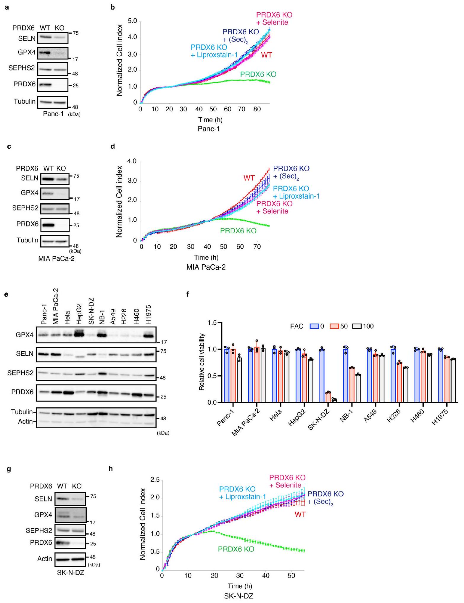 indicated cell lines. , Viability of indicated cell lines in the presence of FAC ( 50 or ) for 48 h . Viability data are presented as the mean s.d. of three biological replicates. g, Immunoblot analysis of lysates from WT or PRDX6 KO SK-N-DZ cells. , Continuous monitoring of the viability of WT or PRDX6 KO SK-N-DZ cells in the presence or absence of sodium selenite , or liproxstatin-1 ( ). Viability data ( ) are presented as the mean s.e.m of three biological replicates. Data (a, c, e, g) are representative of two independent experiments.