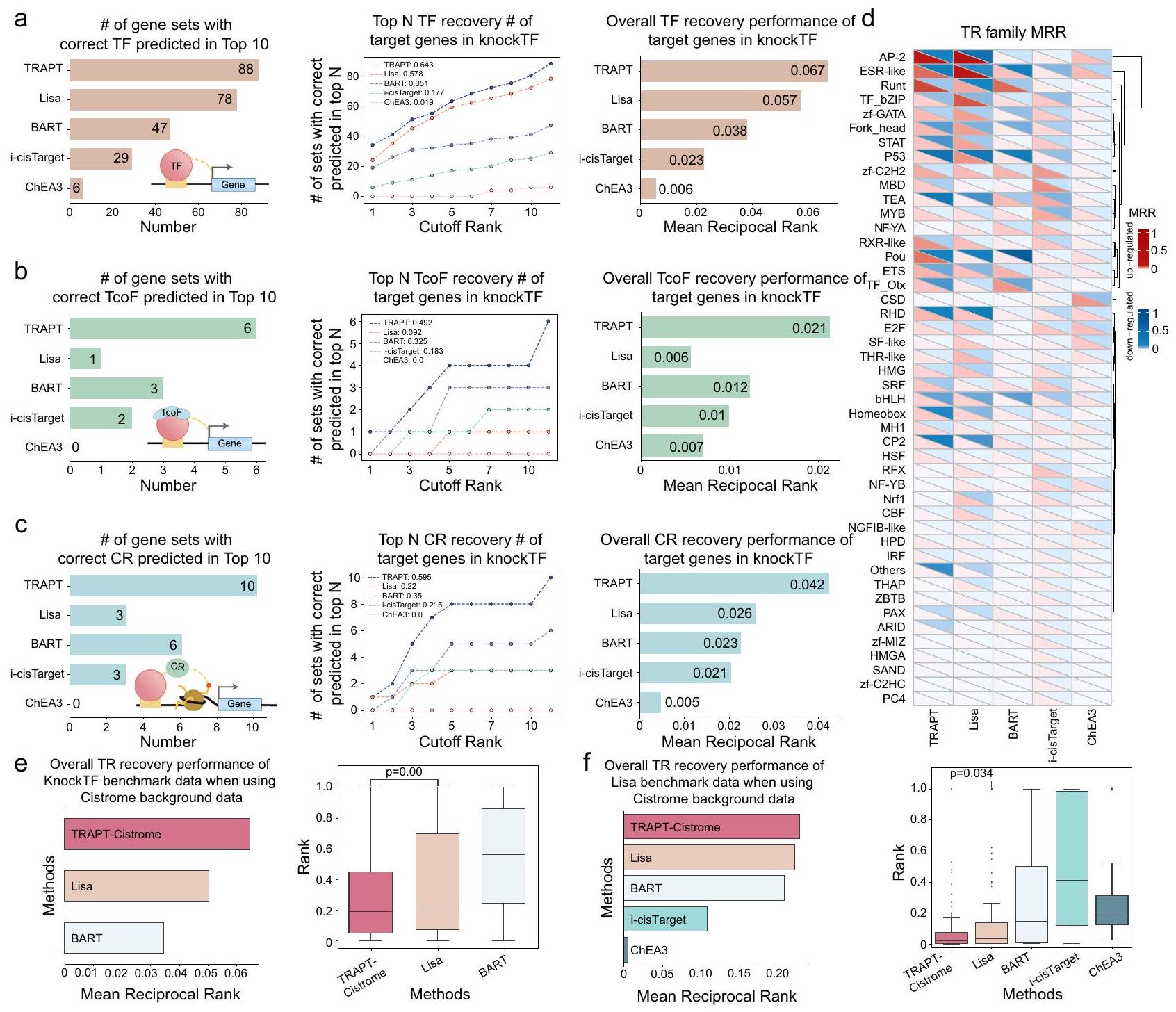 تفوّق TRAPT على ليزا من خلال استخدام نفس بيانات الخلفية عن TRs من قاعدة بيانات Cistrome، واستخدم بيانات KnockTF كمعيار. تفوّق TRAPT على ليزا بـ و BART بواسطة من حيث الأداء العام، حتى عند استخدام نفس بيانات الخلفية (الشكل 2e). تم إجراء تحليلات تجريبية إضافية على استراتيجية TRAPT-Cistrome لتعزيز استنتاجاتنا. على وجه التحديد، قمنا بتقييم أداء TRAPT عبر ثلاث فئات: TF و CR و TcoF. تفوق TRAPT على ليزا بـ و BART بـ في تصنيف أفضل 10 من TFs بناءً على درجات AUC (الشكل التكميلي 2b). قمنا بتقييم الأداء العام لـ TRAPT لـ CR و TcoF، حيث تفوق على ليزا بـ و BART بـ على التوالي (الشكل التكميلي 2b). نحن