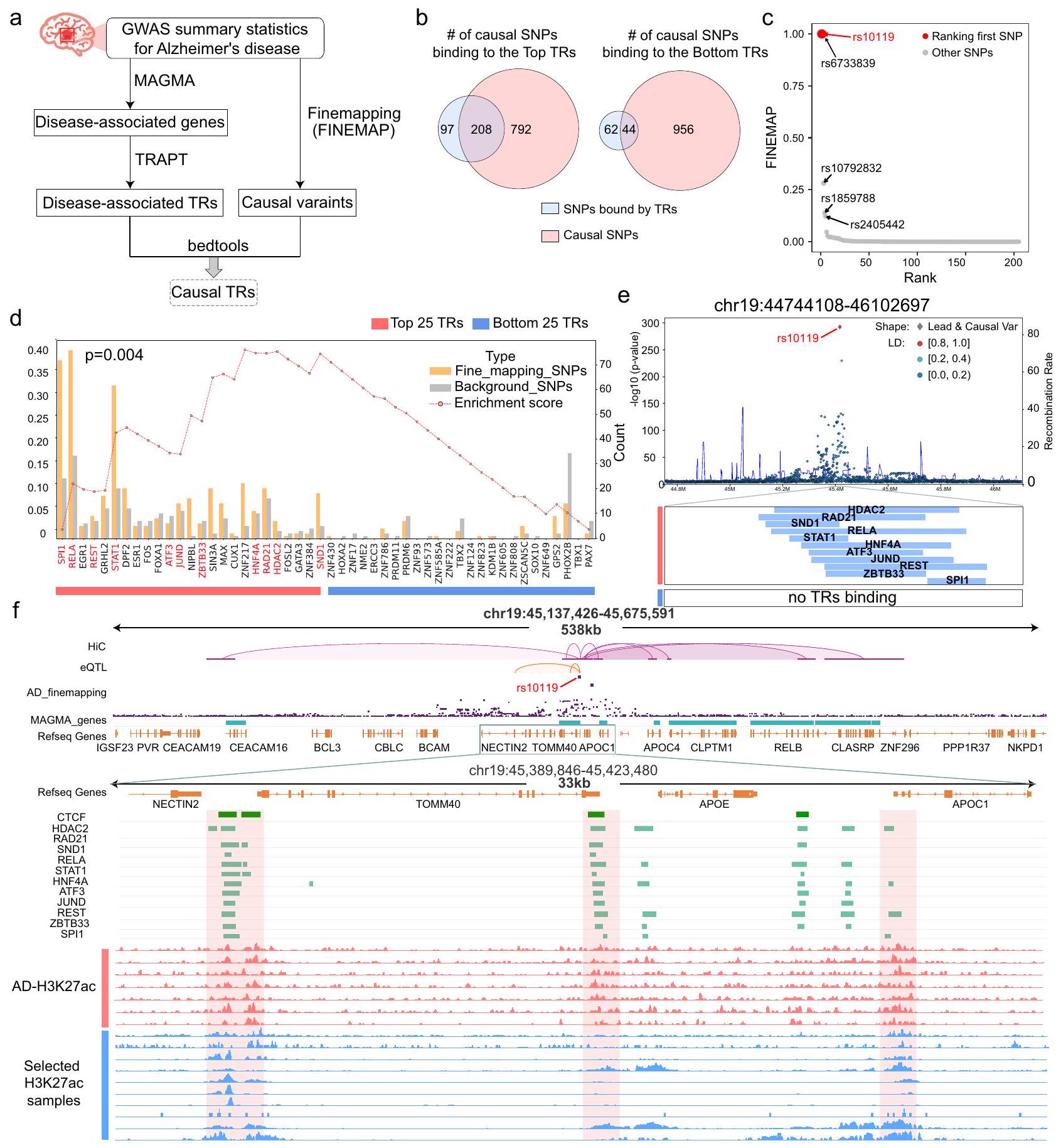 لتحديد المتغيرات السببية المرتبطة بالمرض المرتبطة بـ TRs التي تم التنبؤ بها بواسطة TRAPT واستكشاف ارتباطاتها المحتملة، قمنا بعد ذلك بتحليل التداخل بين المتغيرات السببية ومواقع الربط المتوقعة لـ TRs. احتفظنا بالمتغيرات السببية المتداخلة وقمنا بترتيبها بناءً على FINEMAP. الدرجات. من بين 1,000 متغير سببي تم اختياره، كان 208 مرتبطين بربط TR، حيث احتل rs10119 المرتبة الأولى كأفضل متغير (الشكل 5c). تحليل التوصيف الوظيفي باستخدام VARAdb كشفت أن rs10119 كان منظماً بواسطة عدة سوبر-معززات تغطي العديد من الجينات المهمة القريبة، بما في ذلك APOE و TOMM40 و APOC1، وكان SNP مرتبطاً بالمخاطر لمرض الزهايمر. بعد ذلك، قمنا بتحليل التوطن المشترك بين rs10119 و تم التنبؤ بـ TRs. ومن الجدير بالذكر أننا لاحظنا ارتباطًا في تسعة من أعلى 25 TR في منطقة 1 كيلوبايت upstream و downstream من rs10119، بينما لم تظهر TRs ذات الترتيب الأدنى أي ارتباط في هذه المناطق (الشكل 5e). وقد درست دراسة سابقة تأثير REST، وهو عامل نسخي، كميزة عالمية للشيخوخة الطبيعية في الخلايا العصبية القشرية والهيبوكامبية البشرية. كما يمكنه أيضًا حماية الخلايا العصبية من الإجهاد التأكسدي والأميلويد.-سمية البروتين. لاحظنا أن REST احتل مرتبة عالية في توقعات TRAPT، وقد أظهرت الدراسات السابقة دوره الحاسم في تطور مرض الزهايمر. إنه يثبط الجينات التي تعزز موت الخلايا ومرض الزهايمر، بينما يحفز التعبير عن الجينات المرتبطة باستجابة الإجهاد.. تم تحديد TRAPT كأفضل-