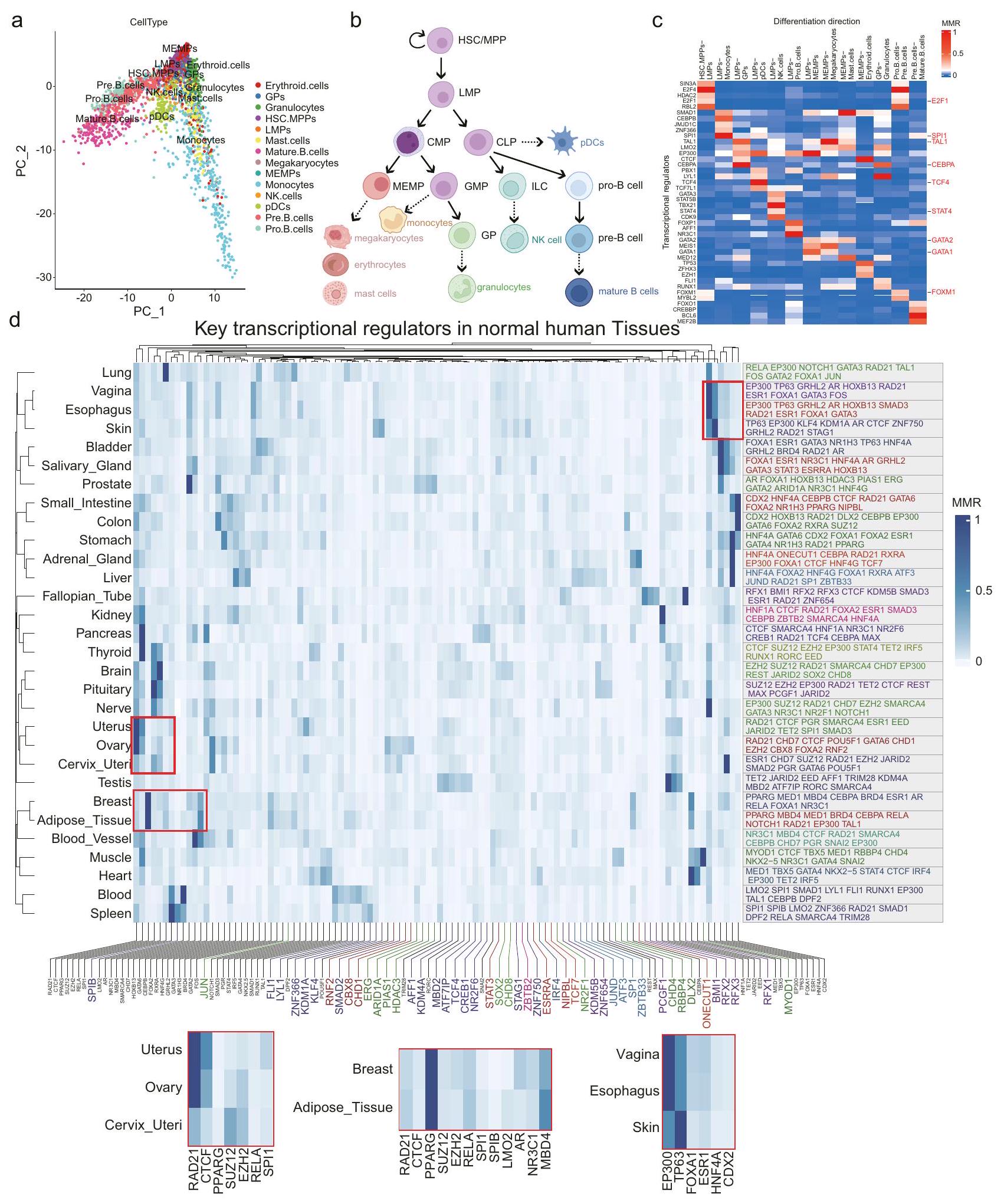 Fig. 6 | Identification by TRAPT of transcriptional regulators associated with cell fate and tissue identity. a Visualization of principal component analysis (PCA) derived from scRNA-seq data. b Classic model of the landscape of hematopoietic differentiation. c Heat map displaying the MRR scores of lineage-specific transcriptional regulators obtained by TRAPT across directions of cell differentiation. d Heat map showing the top 100 TRs according to MRR scores, predicted by TRAPT